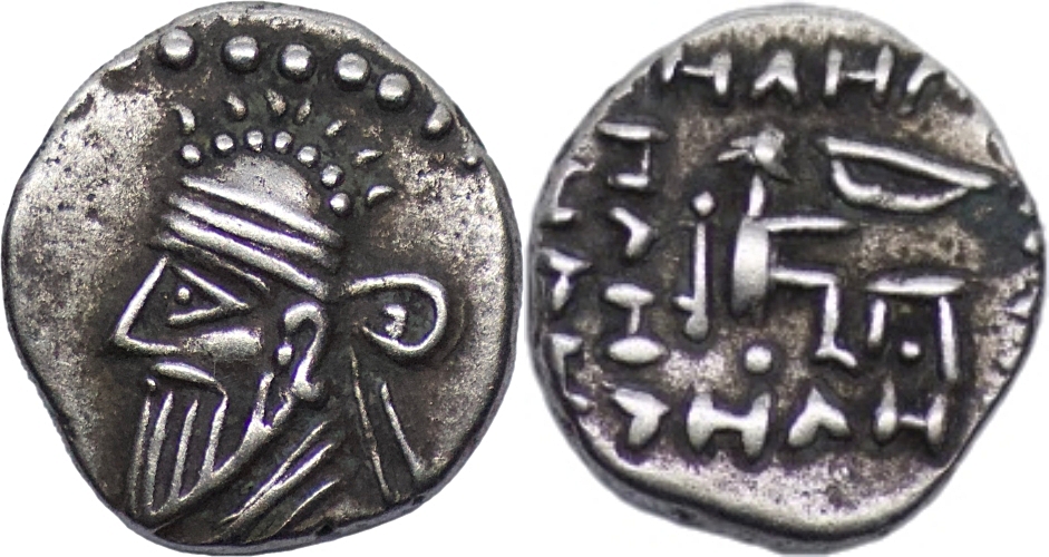 Pacorus II (AD78-120), AR Diobol, (1.36g), draped bust left wearing diademed tiara with “hooks” on crest, rev. square five-line blundered legend, archer seated right, holding out bow, monogram below (Shore 402; Sunrise 436; Sellwood, Num. Chron. 1989, type 8, pl. 42), toned, very fine. Ex Spink auction.