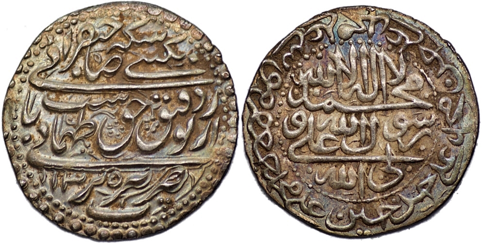 Safavid, Tahmasp II, AH 1135-1145 (AD 1722-1732). AR abbasi (5.44g/ 28 mm). Tabriz mint. Dated AH 1135 (AD 1722/3). Farahbakhsh 148-1 (4 shahi); SICA 9, 567; Album 2689.1. Double strike, Beautiful rare rainbow patina. Choice AU. Toned.