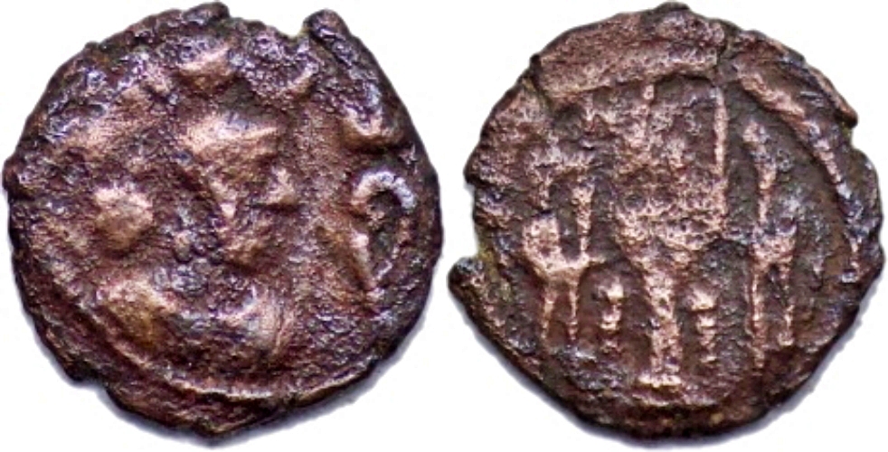 SASANIAN EMPIRE, Yazdgard I, AD 399-420. Æ Pashiz (1.16g/ 13mm). Bust of Yazdgard I on floral ornament right, wearing mural crown with frontal crescent and korymbos, symbols in front / Fire altar, flanked by two attendants. Lovely strike on a nice broad flan. Nice original green earthen patina. Extremely fine.