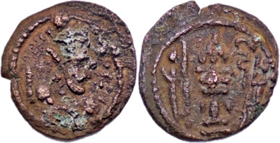 SASANIAN EMPIRE, Vahram V (Varahran), AD 420-438, AE Pashiz (0.81g/ 11mm). Vahram’s bust right /fire-altar and two attendants; Mint place WH (Veh-Ardashir (Seleucia)) to right of the fire altar. Well struck on a nice flan. Choice VF. RARE.