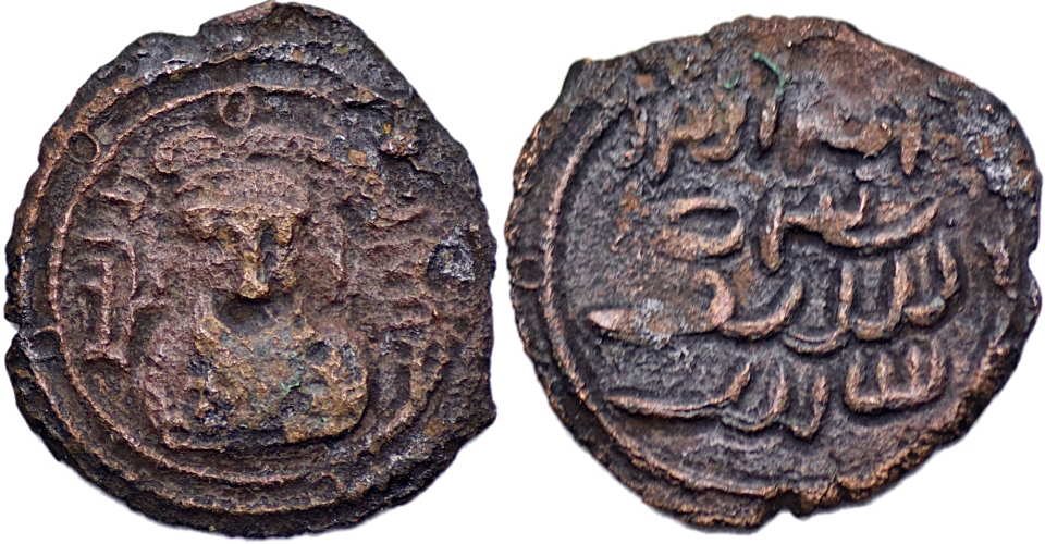 ARAB-SASANIAN: Anonymous, ca. 690-715, AE pashiz (1.84g/ 17mm), Facing bust, scripting to left and right/ legends in Pahlavi. Extremely rare and very fine.