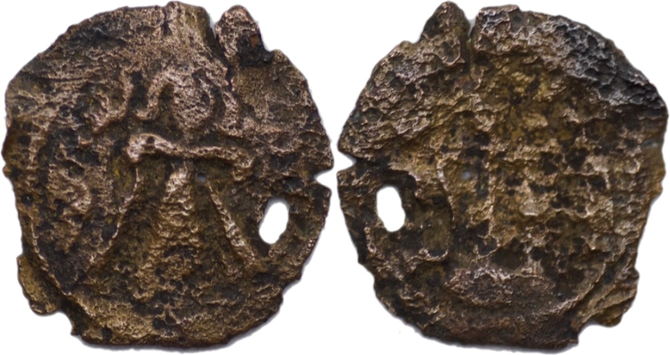 ARAB-BYZANTINE: Standing Caliph, ca. 692-697, AE fals (0.70g/ 14mm), possibly temp of ‘Abd al-Malik. Rare.