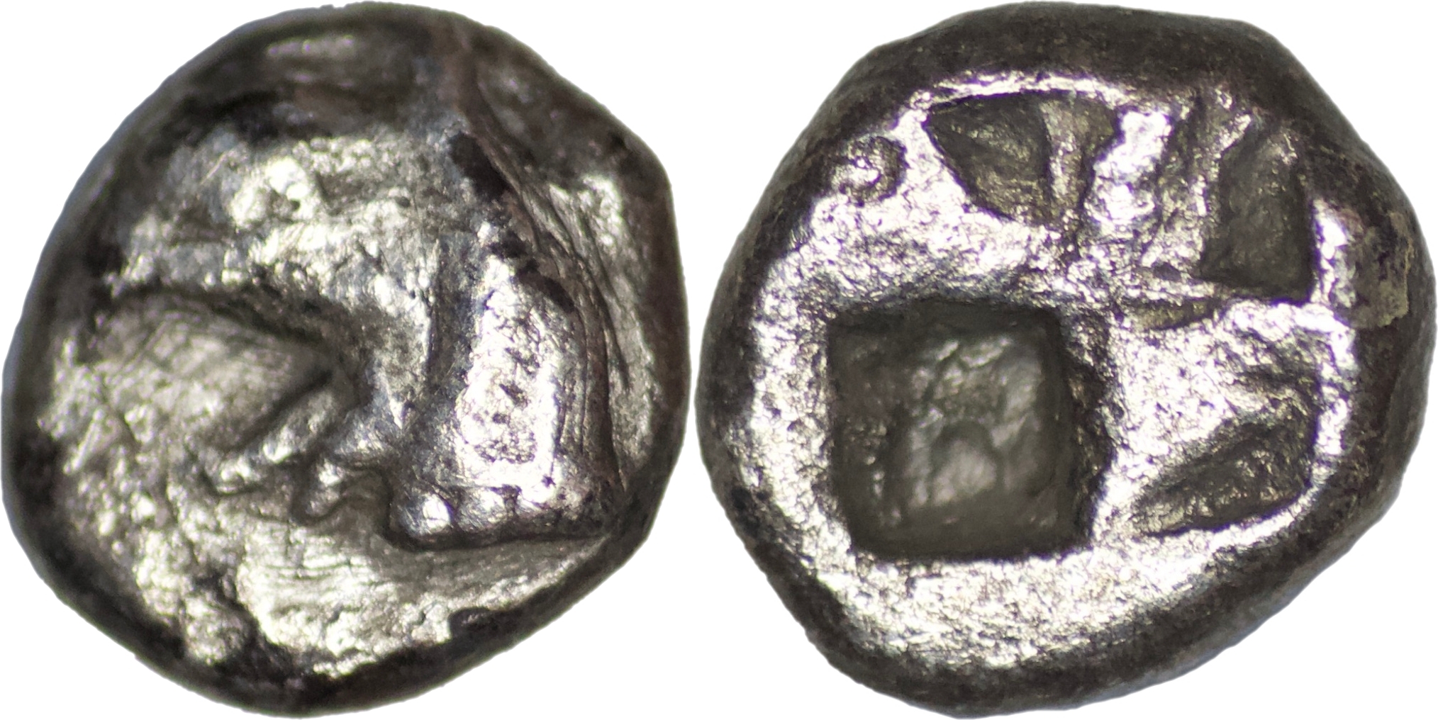 Aeolis, Kyme, c. 450-400 BC. AR Trihemiobol (1.35g/ 90mm). Head of eagle l.; K to l. R/ Quadripartite incuse square. SNG von Aulock -; SNG Copenhagen -, cf. 32 (hemiobol); SNG München -. Very fine. Example: Roma E-sale 99 sold for £347.