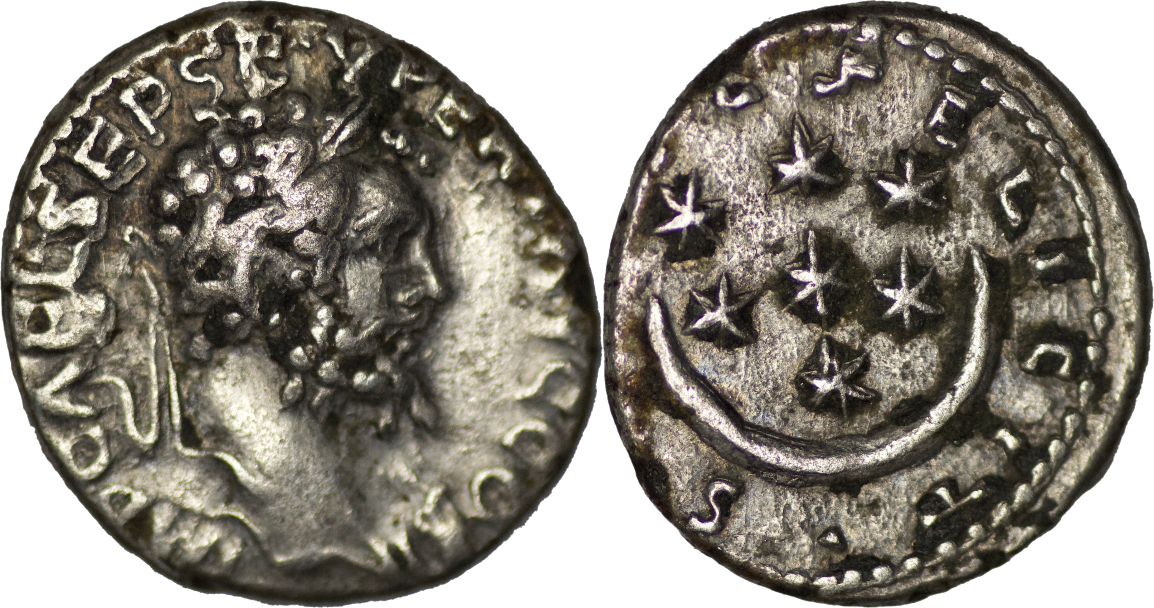 Septimius Severus, 193-211. AR Denarius (3.17g/ 16mm), Emesa, 194-195. IMP CAE L SEP SEV PERT AVG COS II Laureate head of Septimius Severus to right. Rev. SAECVL FELICIT• Crescent with seven stars. BMC 390. Cohen 628. RIC 417. An attractive example of this interesting type. Very fine. Ex Mark Salton collection.
