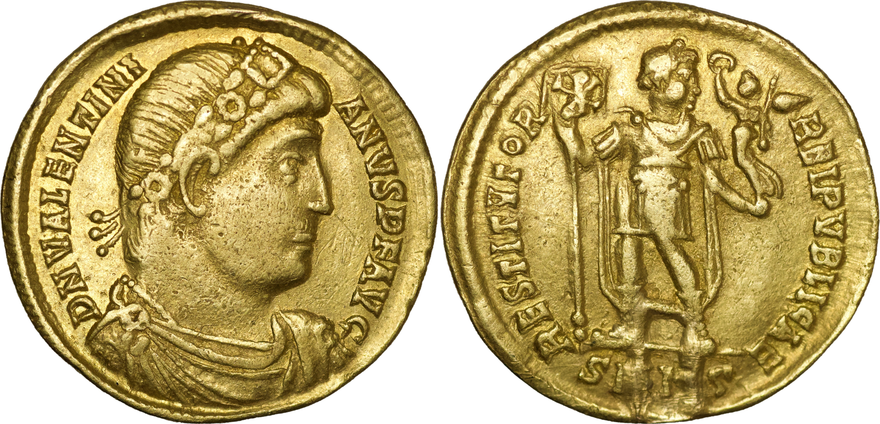 Valentinian I (AD 364-375), AV Solidus (4.33g/ 20mm). Nicomedia, 10th Officina, struck c. 364-367, D N VALENTINIIANVS P F AVG, pearl-diademed, draped and cuirassed bust right, rev. RESTITVTOR REPVBLICAE, emperor in military dress standing facing, head right, grounded labarum inscribed with Christogram in right hand, Victory on globe in outstretched left hand, SMNI in exergue. RIC 2a.2). Mount removed at 6 O’Clock, otherwise near Extremely fine.