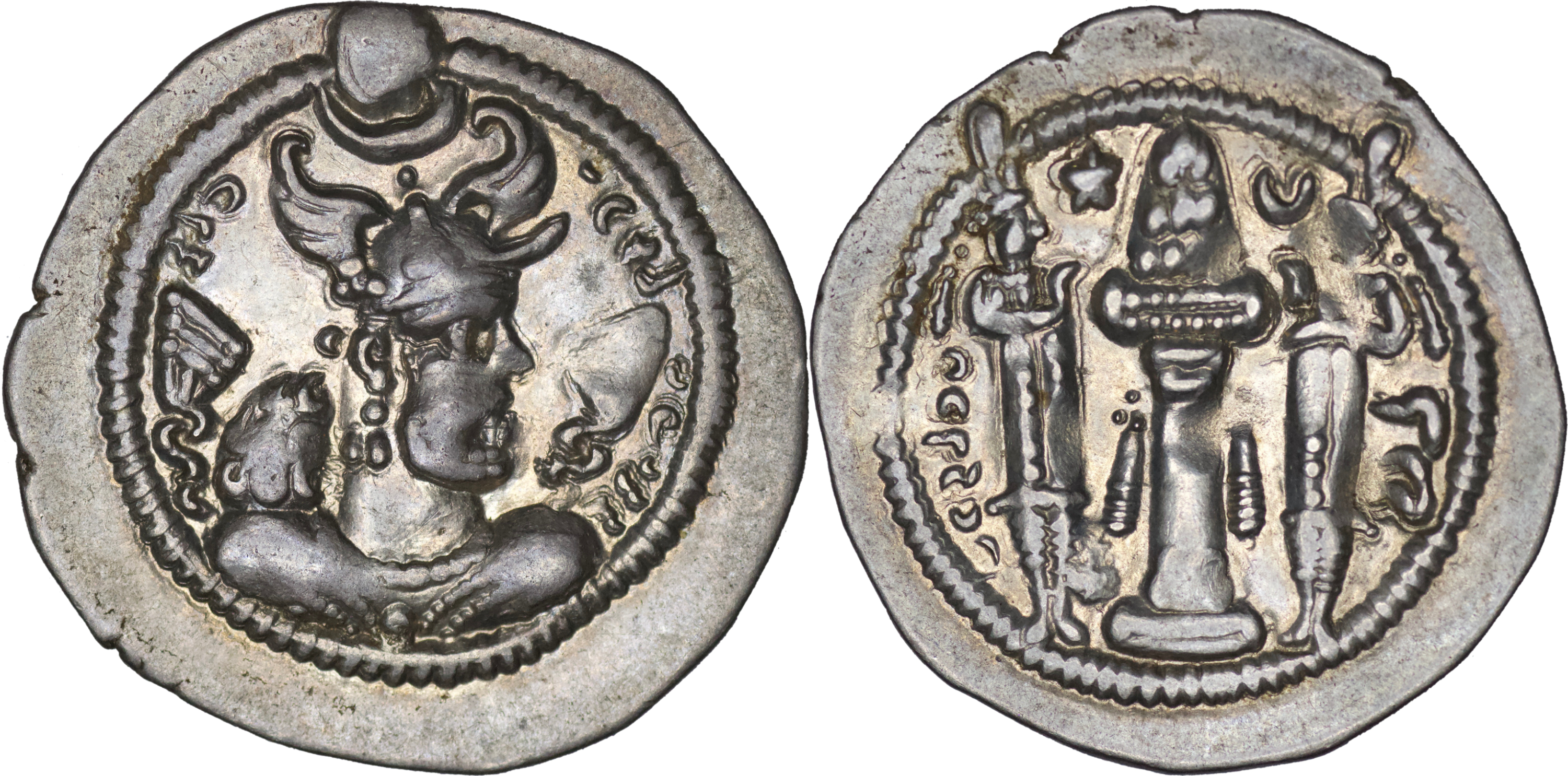 Sasanian Empire: Peroz (457-484), AR Drachm (4.12g/ 26mm), LYW mint. Draped bust of Peroz I to right, wearing elaborate crown with korymbos set on crescent. Rev. Fire altar with ribbons, flanked by two attendants, star and crescent. Göbl pl. 10, 171. SNS III Type IIIb/1c. Toned. Extremely fine. From The Zabel collection (Pat Zabel).