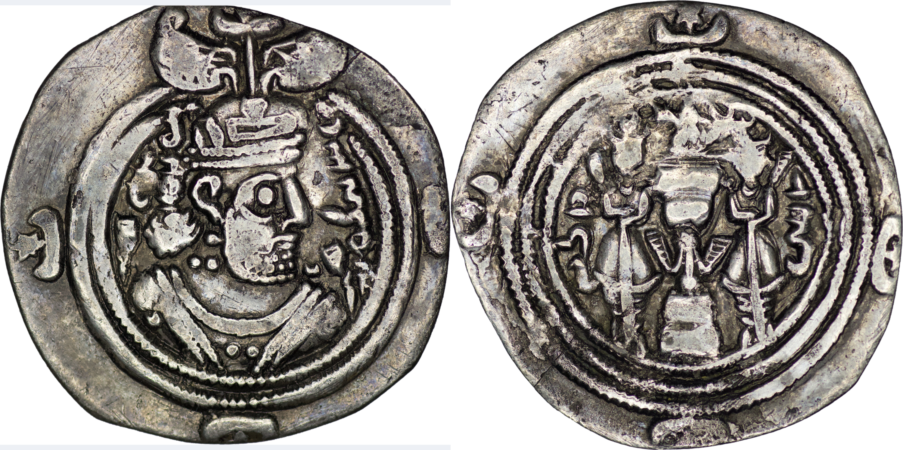 SASANIAN EMPIRE: HormizdVI, 631-632, AR drachm (2.37g/ 25mm), WHYC (the Treasury mint), year 2, Göbl 230. Fine. Clipped during Arab conquest of Iran to reduce weight.