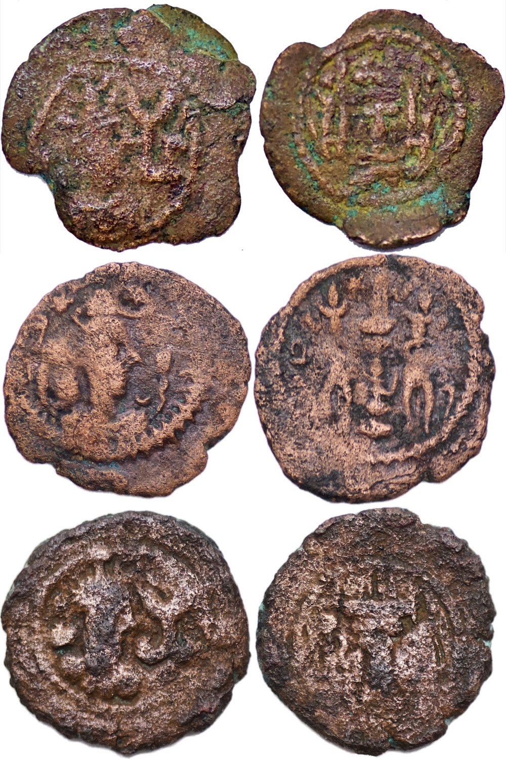 Group Lot of 3 Sasanian AE Pashiz, including: 1) SASANIAN EMPIRE. Yazdgard II. A.D. 438-457. Æ Pashiz (1.09g/ 15mm). Bust of Yazdgard II right; monogram to right / Fire altar with two attendants. Very rare. fine. 2) SASANIAN EMPIRE: Khusro I, 531-579, AE pashiz (0.96g/ 14mm), year 9?, standard design, blundered mint name (AY?), VF, R. 3) SASANIAN EMPIRE: Shapur II, 309-379, AE Pashiz (1.59g/ 14mm), very rare subtype with the king’s portrait without mural tiara with korymbos; Symbol to the right, F-VF, RR. Illustrated by Göbl only for the gold dinar (G-113).