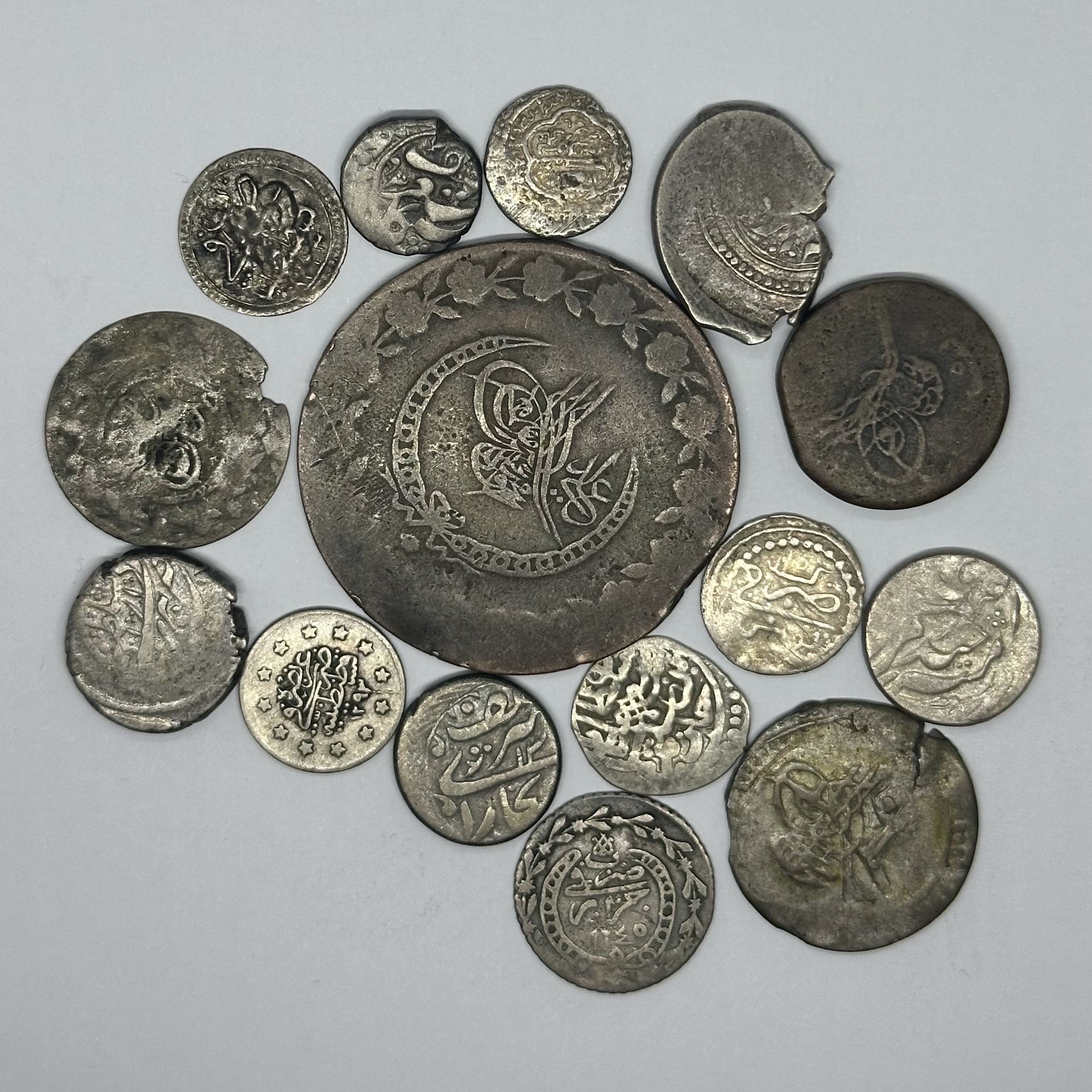 Group Lot of 15 AR and AE Islamic Coins. Different properties, including Ottoman Empire, Bukhara and Qajar. Fine to very fine.