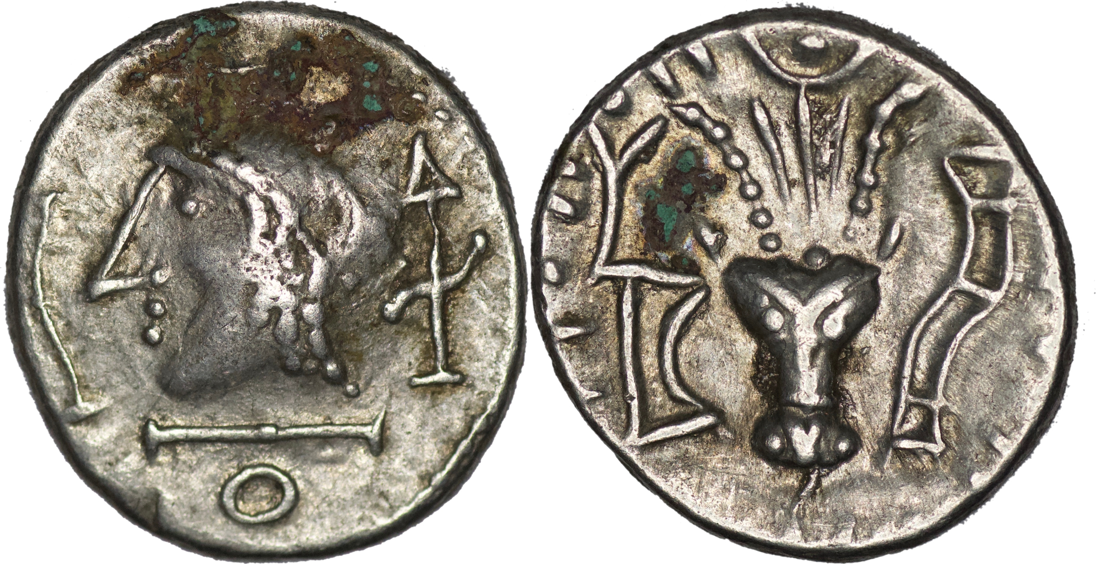 Himyarites of Arabia; Anonymous. Circa 1st Cent. AD. AR Drachm (2.56g/ 15mm). Diademed male head left / Bucranium with antelope’s horn and plumes. Cf. SNG ANS 1554-1556. Original patina, extremely fine
