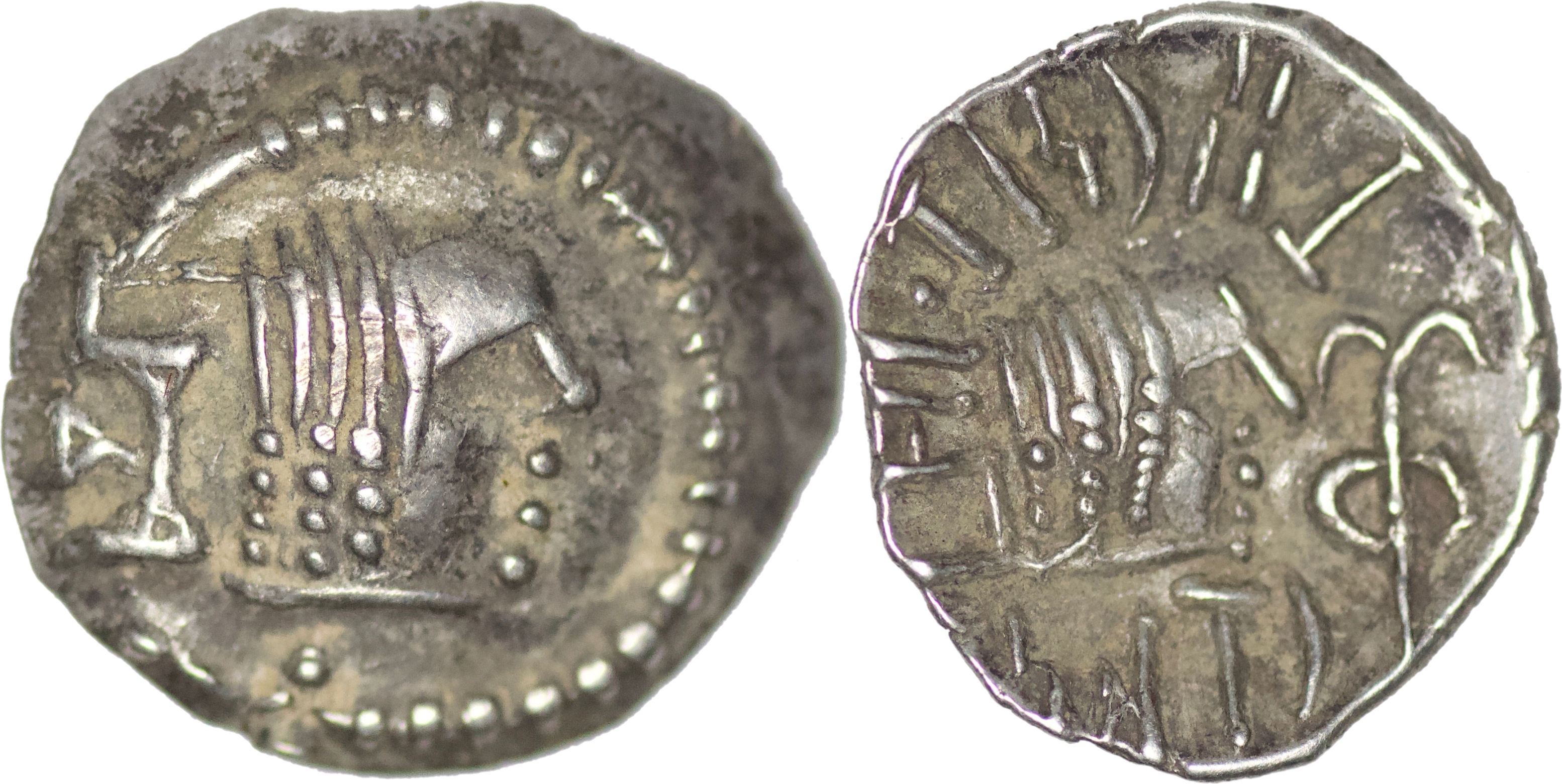 ARABIA, Himyarites. Amdan Bayyin. 50-150 AD. AR quinarius (1.73g/ 13mm). Male head right surrounded by torc / Small male head right surrounded by Sabaean inscription and monogram. SNG ANS 1576; Munro-Hay. pg.158,3.2bi. Extremely fine.