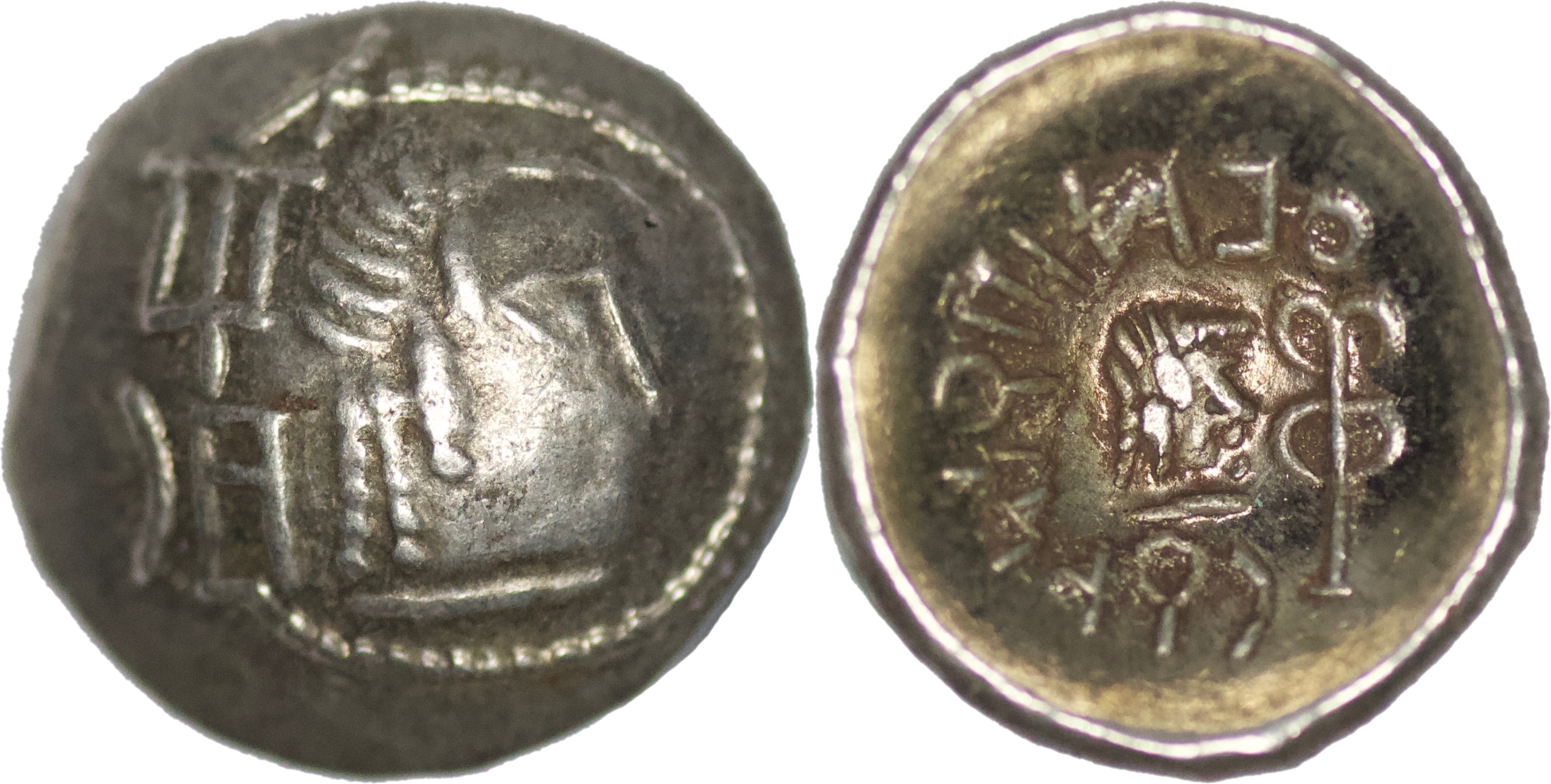 ARABIA, Himyarites. Amdan Bayyin. 50-150 AD. AR quinarius (1.21g/ 12mm). Male head right surrounded by torc / Small male head right surrounded by Sabaean inscription and monogram. SNG ANS 1576; Munro-Hay. pg.158,3.2bi. Extremely fine.