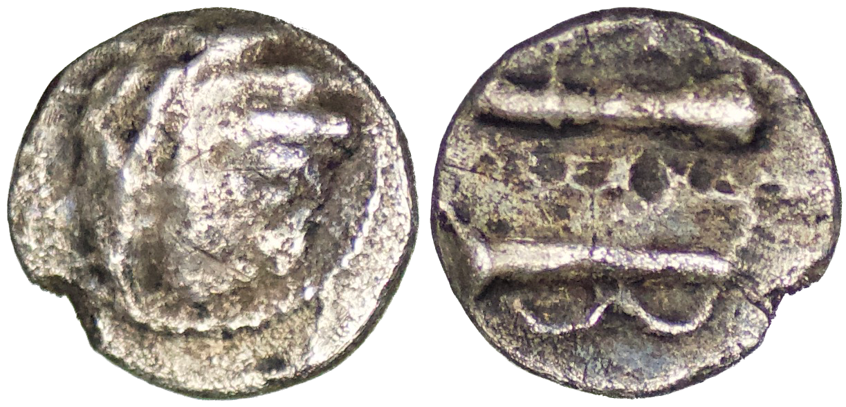 SELEUKID KINGS OF SYRIA. Seleukos I Nikator, 312-281 BC. Obol (0.30g/ 7mm), Babylon, circa 311-300. Head of Herakles to right, wearing lion skin headdress. Rev. Club, quiver and bow; to left. Price 3706. SC 85. Weight and size are a bit less than the similar types (Other types weight and size: 0.7/ 9mm). Very fine.