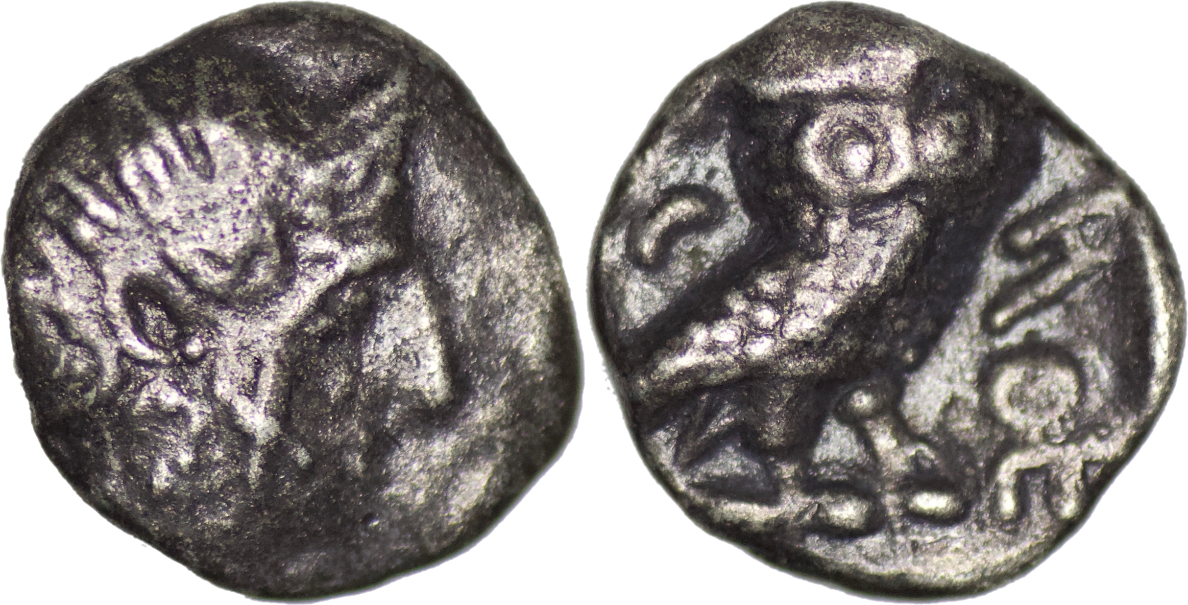 ARABIA: SABAEAN: Anonymous, ca. 3rd-2nd century BC, AR 1/4 unit (1.01g/ 10mm), Imitating Athens. Helmeted head of Athena right; Arabian letter ‘T’ (mark of value) on cheek / AΘE, owl standing right, head facing; crescent moon in upper left field. Van Alfen in CCK Group SIV.A, 268-295; CAF 1.1iii. Very fine, original patina. Very rare.