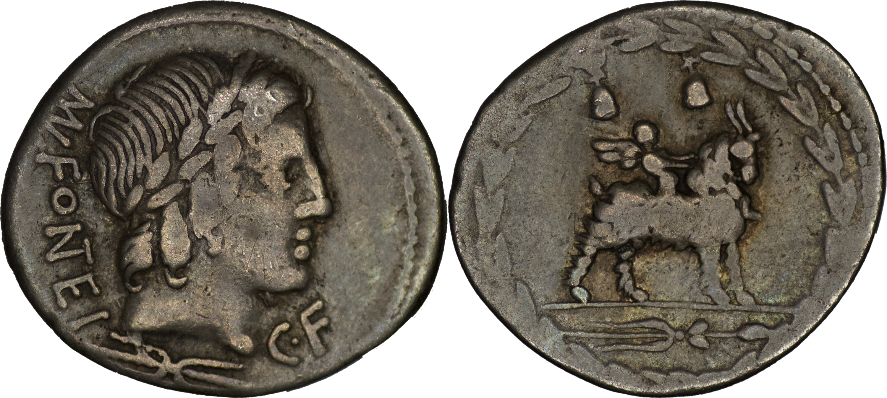 Roman Republic. Mn. Fonteius C.f,. AR Denarius 85, (3.71g/ 18mm) MN·FONTEI Laureate head of Apollo r.; below, thunderbolt and below chin, C·F. Rev. Winged figure on goat r.; on either side, pileus. In exergue, thyrsus. All within laurel wreath. Babelon Fonteia 11. Sydenham 724b. RBW 1352. Crawford 353/1d.