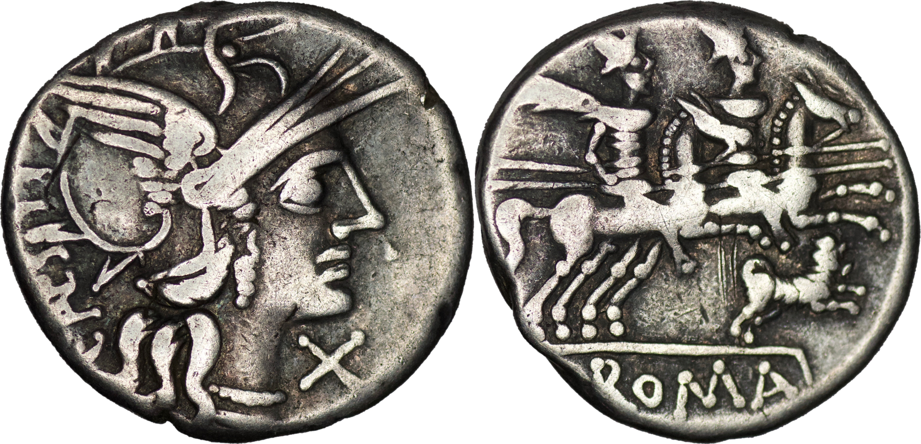 Roman Republic. C. Antestius. AR Denarius 156 (3.42g/ 18mm), Rome. Helmeted head of Roma to r.; behind, C A(NTESTI) in monogram upwards; before, X. Rev. Dioscuri galloping to r., below, dog. ROMA in exergue. Cr. 219/1e. Syd. 411. Very fine. Ex Mark Salton collection.
