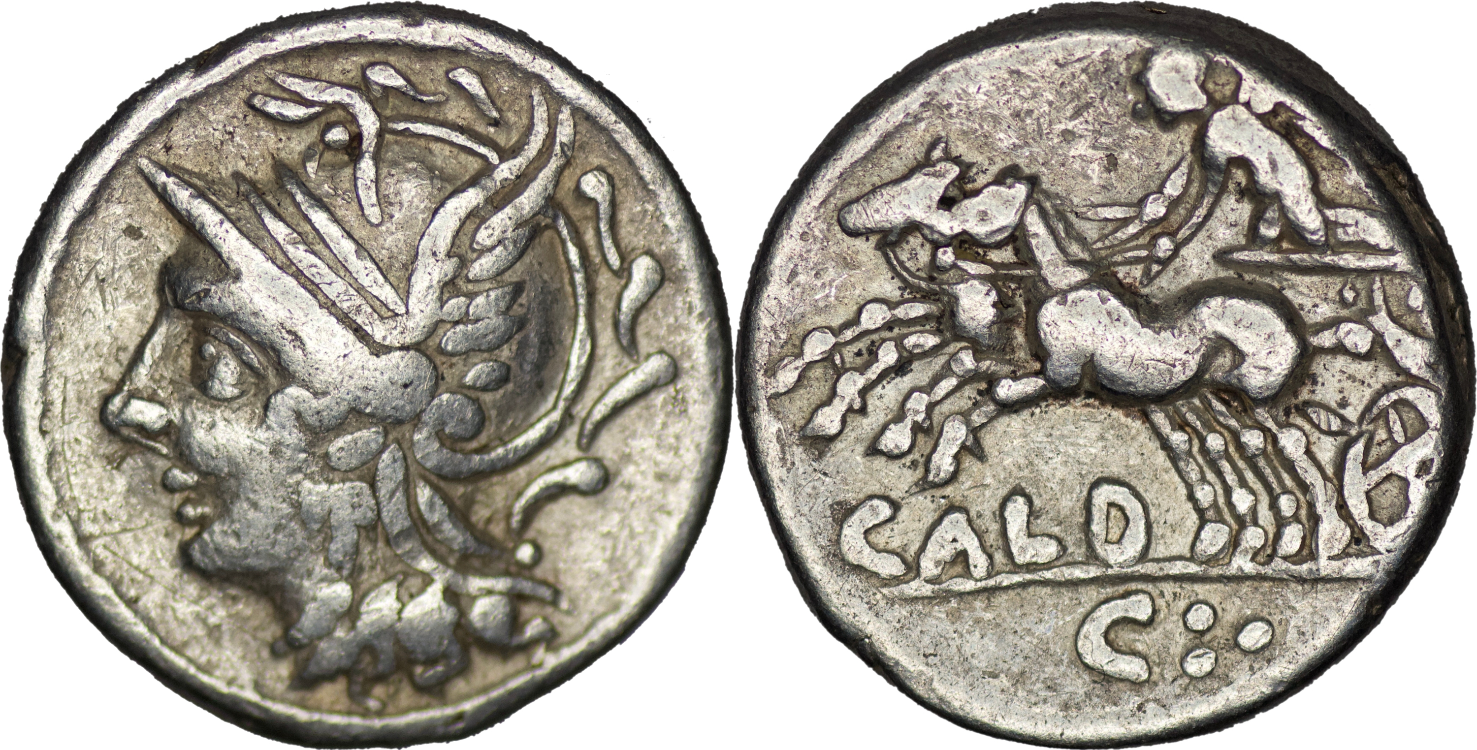 Roman Republic. C. Coelius Caldus AR Denarius (3.83g/ 18mm). Helmeted head of Roma l. Rev. Victory in prancing biga / below, CALD. In exergue, C. Babelon Coelia 3. Sydenham 582a. Crawford 318/1b. Very fine, old cabinet tone. Ex Mark Salton collection. Ex Mark Salton collection.