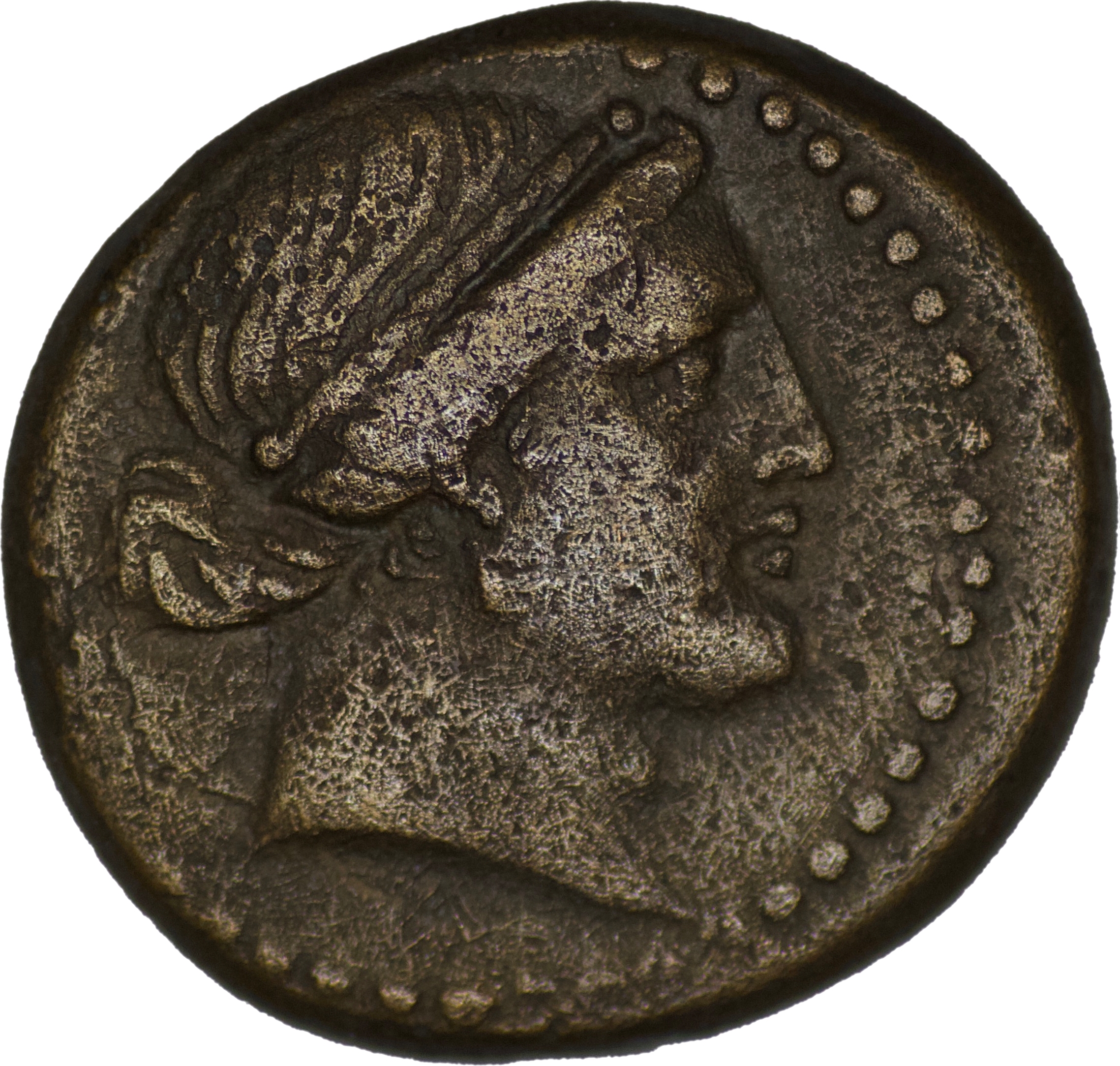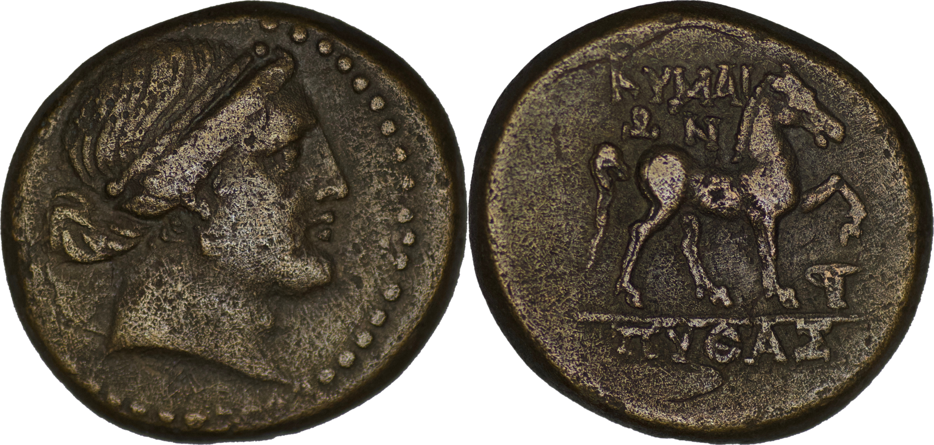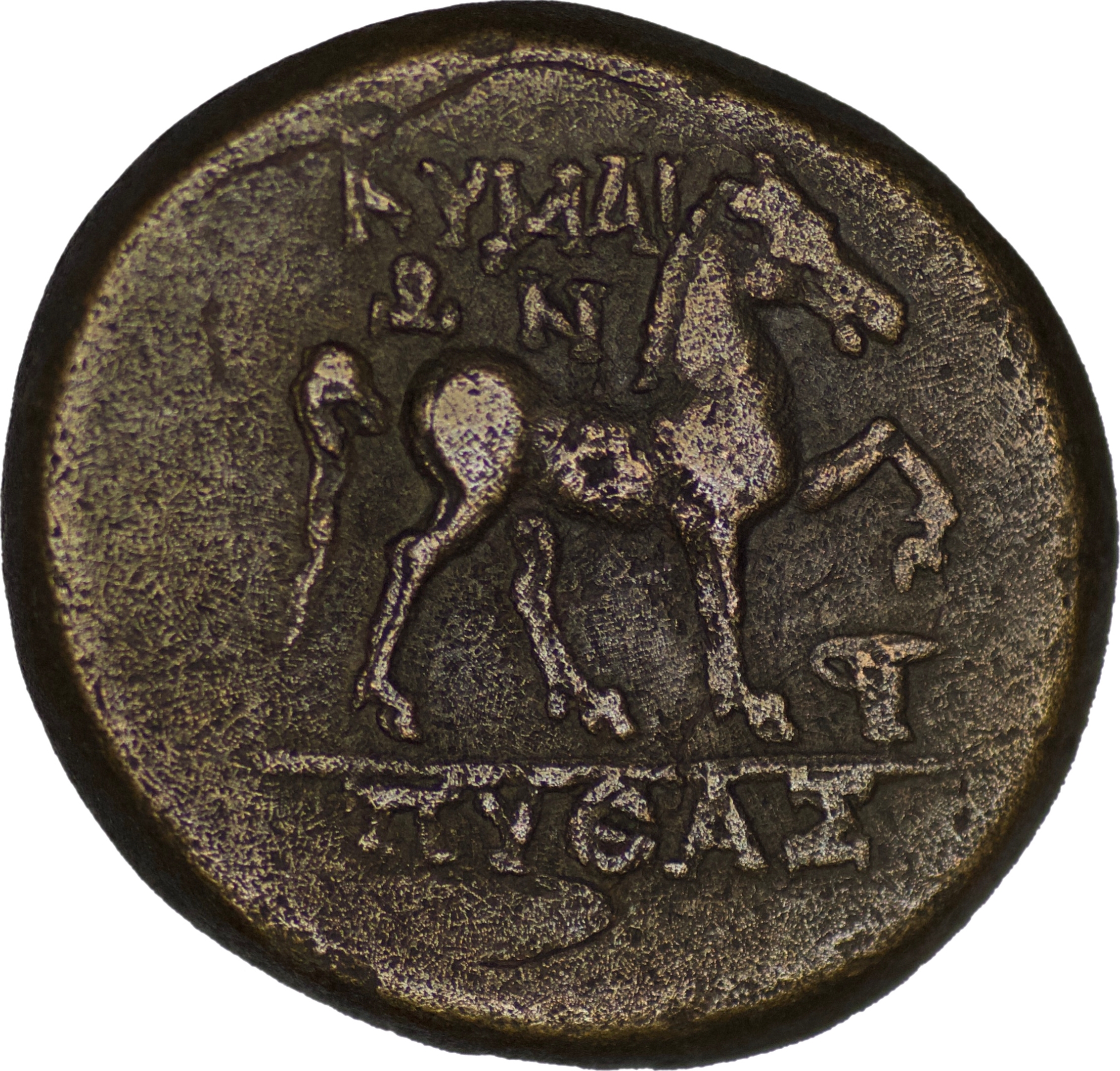 Aeolis. Kyme.(Circa 250-190 BC) Æ (10g/ 20mm) . Pythas, magistrate. Diademed head of amazon Kyme right/ KYMAIΩΝ ΠΥΘΑΣ. Horse prancing right; one-handled cup below raised foreleg. SNG von Aulock 1635; SNG Copenhagen 102. Extremely fine condition.