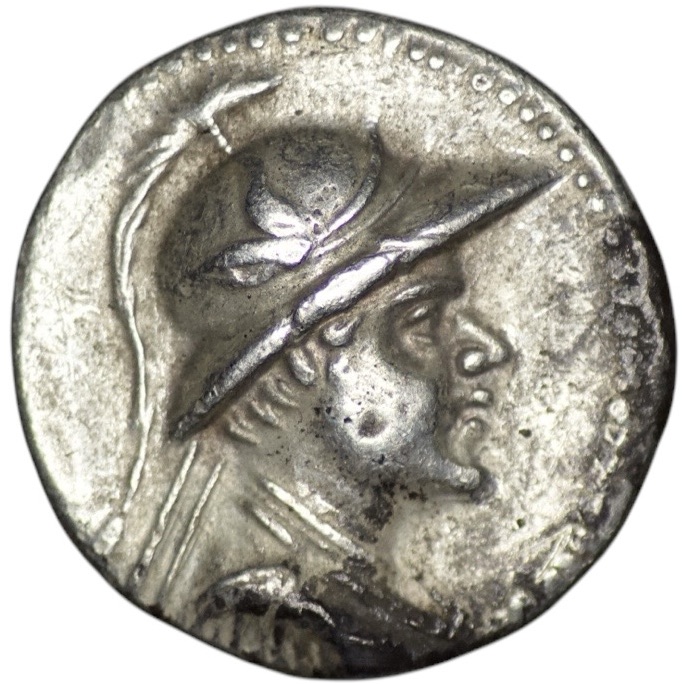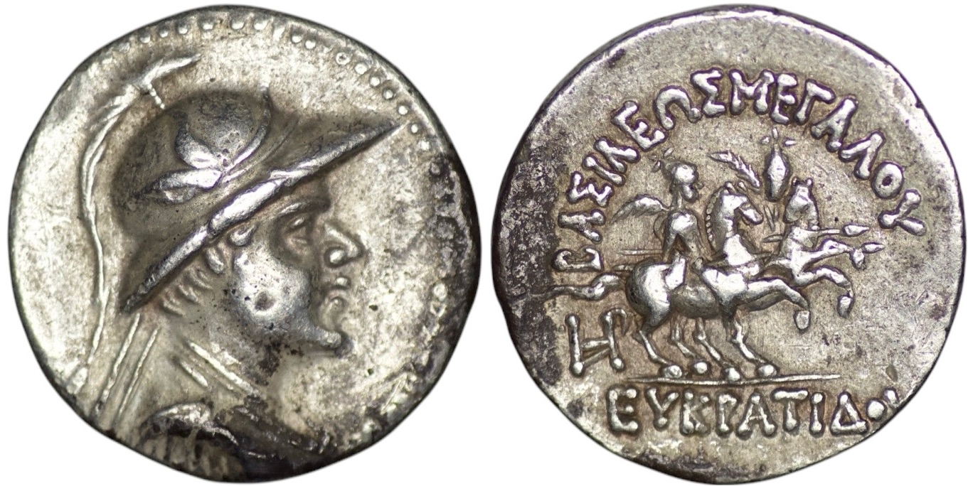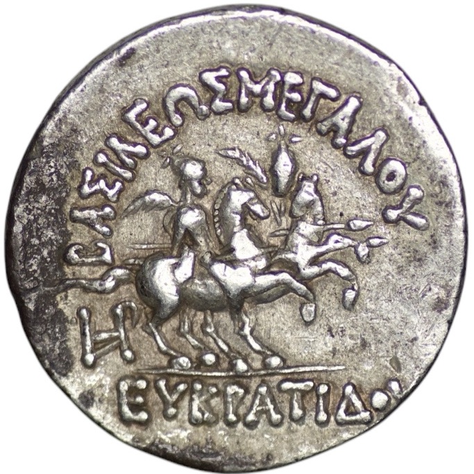 Bactria. Greco-Baktrian Kingdom. Eukratides I Megas (170-145 BC). Uncertain mint in the Paropamisadai or Gadhara. AR Drachm (4.21g/ 19mm). Diademed and draped bust to right, wearing crested helmet adorned with bull’s horn and ear / The Dioskouroi on horses prancing to right, each holding spear and palm; ΒΑΣΙΛΕΩΣ ΜΕΓΑΛΟΥ above, ΕΥΚΡΑΤΙΔΟΥ below, monogram in lower left field. Bopearachchi 7J; SNG ANS 483; HGC 12, 136. Extremely fine.