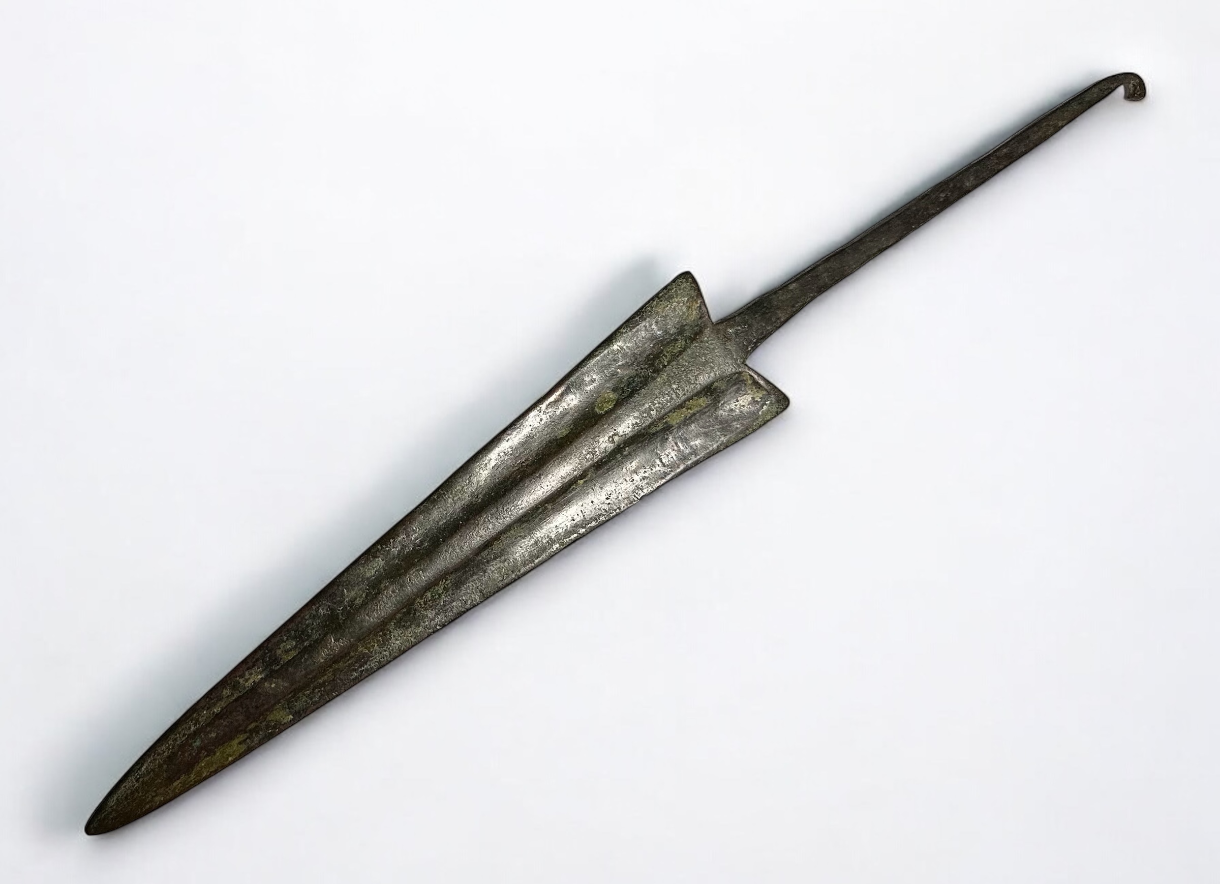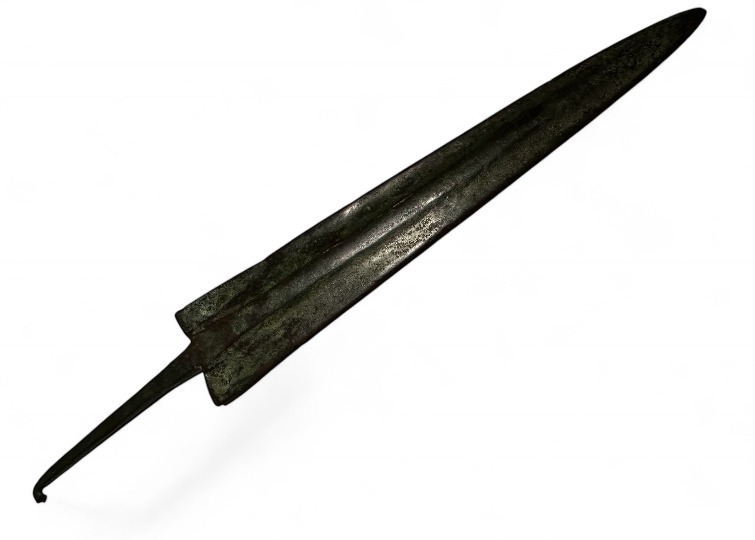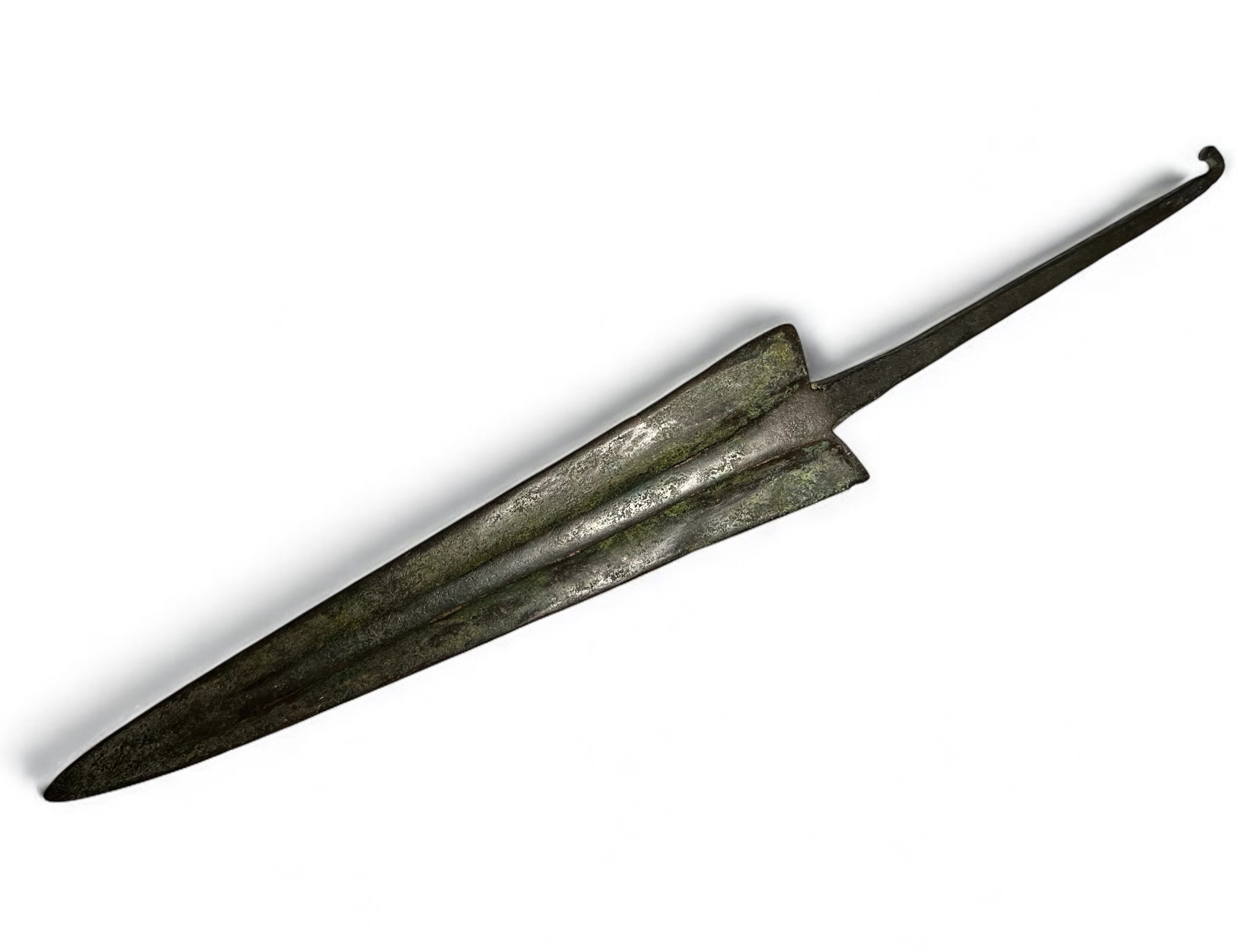 A bronze age spearhead or small sword, dating to the 2nd millennium BC. This artifact features a long, tapered blade with a pronounced central ridge, designed for strength and penetration. The tang extends from the base of the blade, enabling secure attachment to a wooden shaft. Well-preserved with a natural patina from age. Minor surface wear consistent with burial and use.