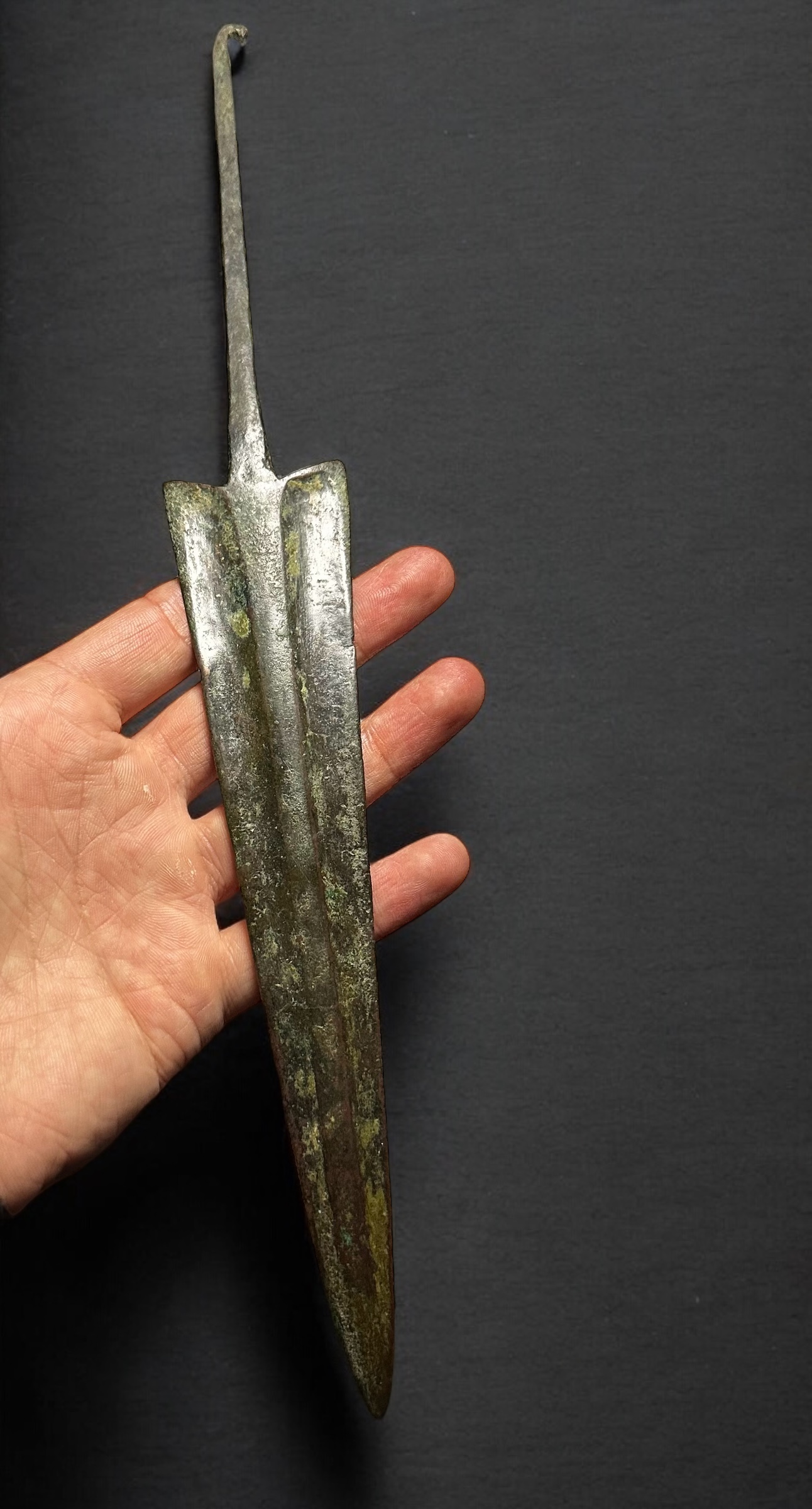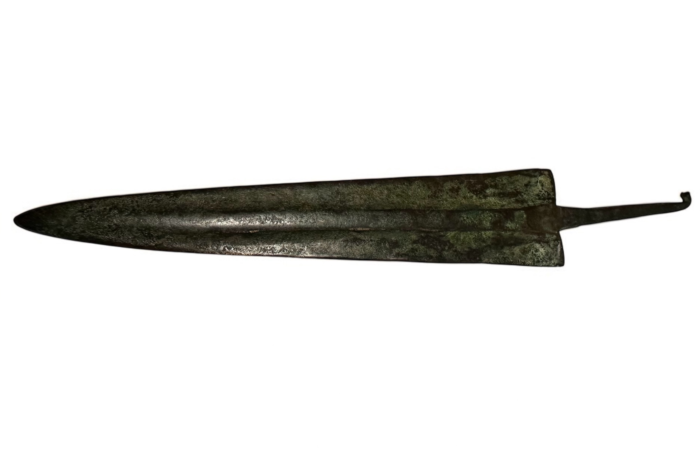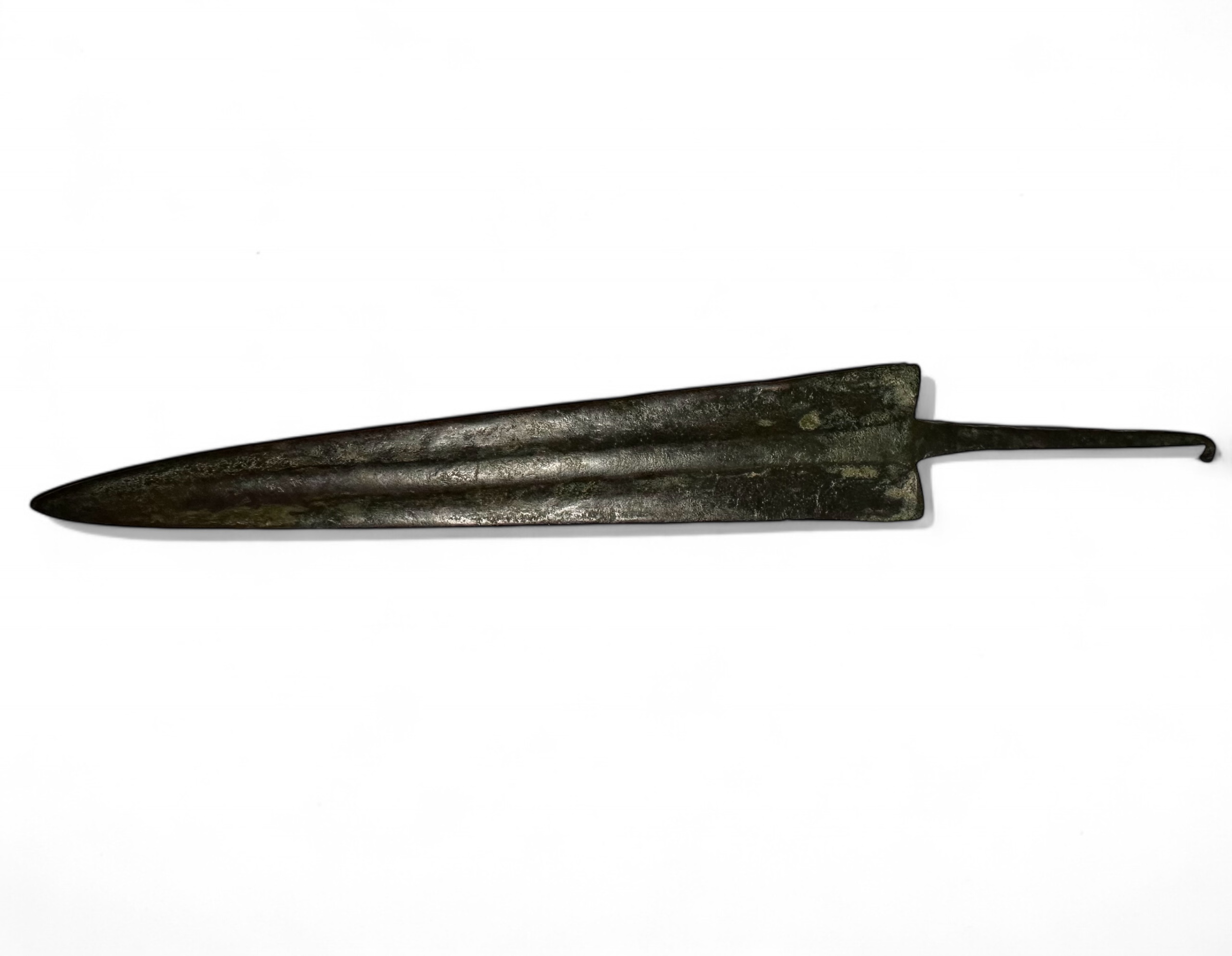 A bronze age spearhead or small sword, dating to the 2nd millennium BC. This artifact features a long, tapered blade with a pronounced central ridge, designed for strength and penetration. The tang extends from the base of the blade, enabling secure attachment to a wooden shaft. Well-preserved with a natural patina from age. Minor surface wear consistent with burial and use.