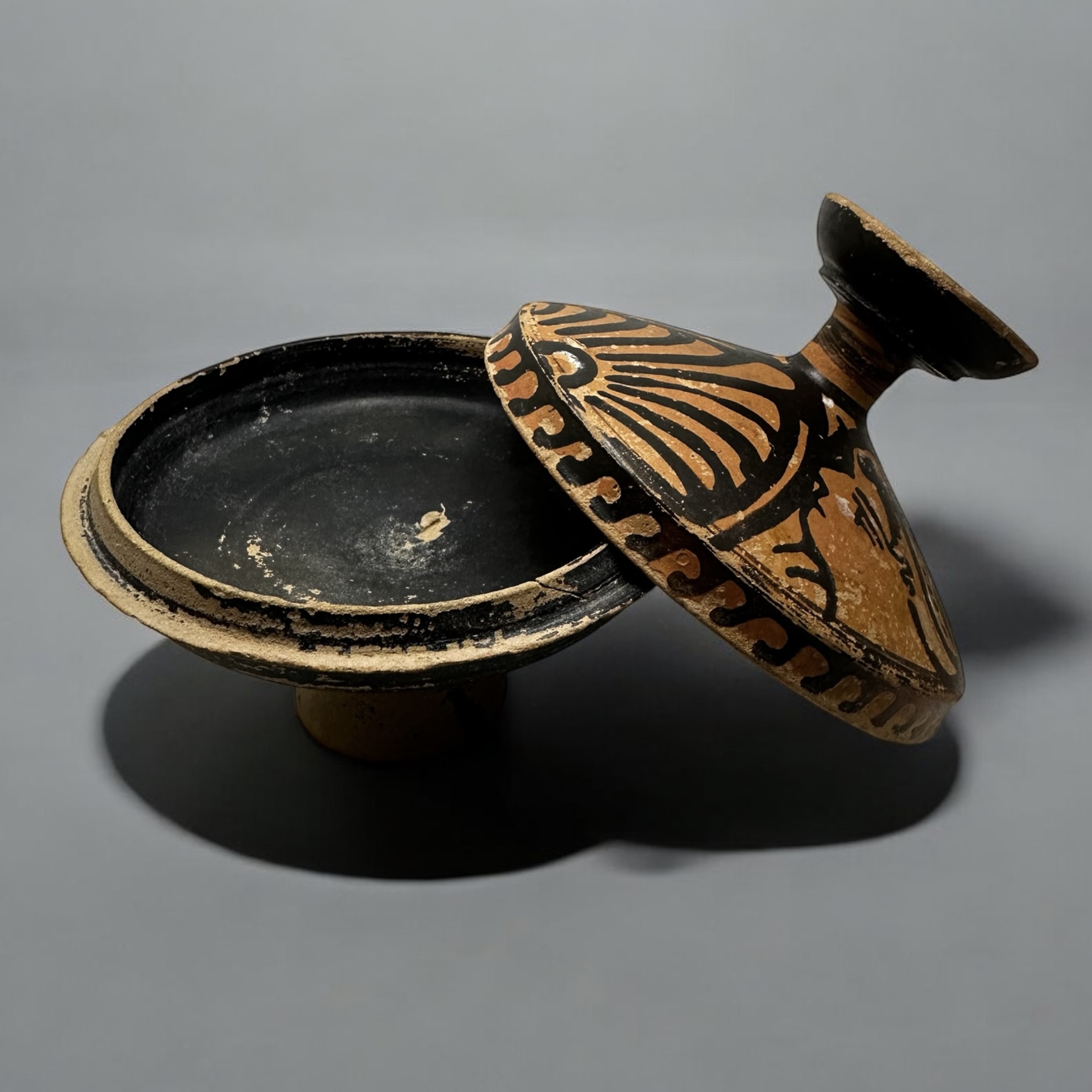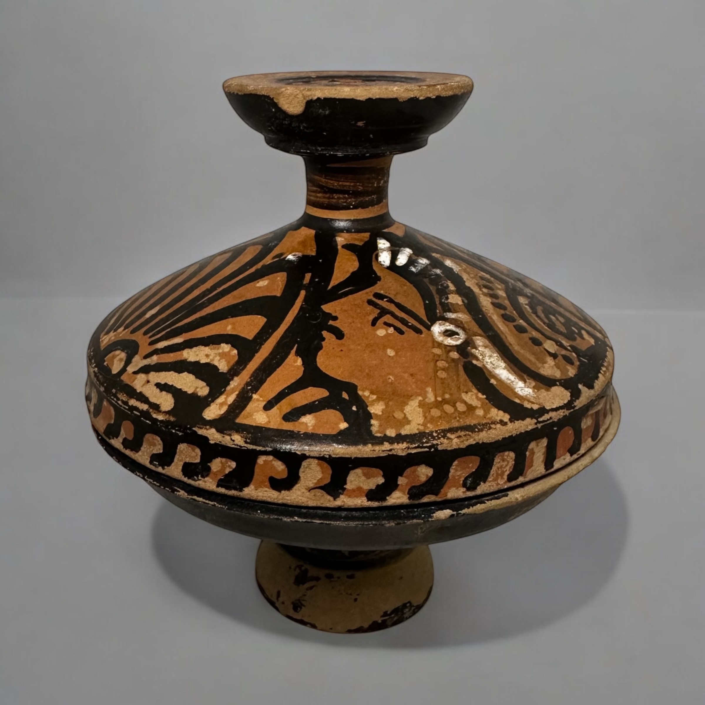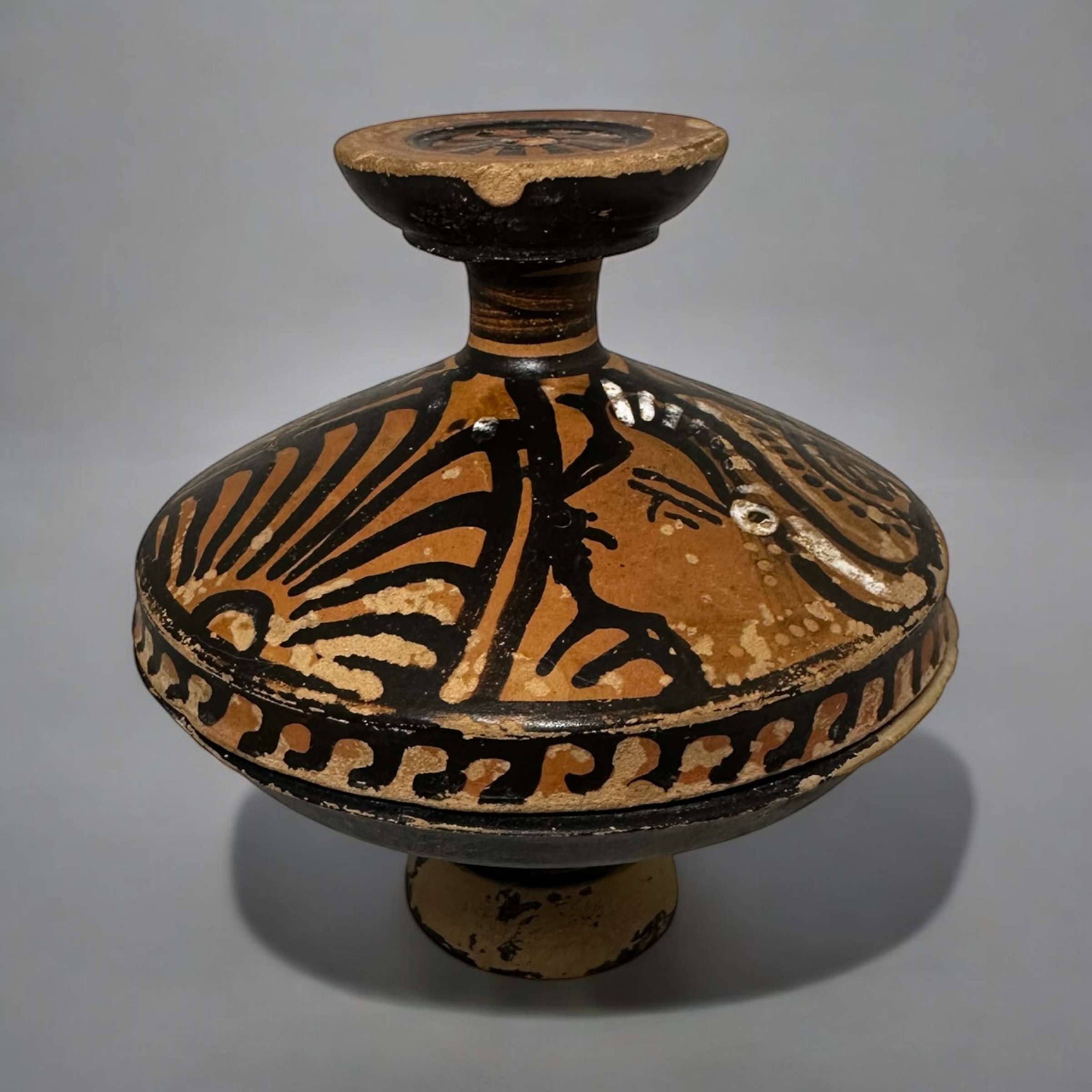 Apulia, South Italy, circa 4th Century B.C. A Greek red-figure lekanis, enlivened in white slip, the lid decorated with two profile female heads, palmettes in between, the top of the knob with radiating petals, the edge of the lip decorated with wave pattern.