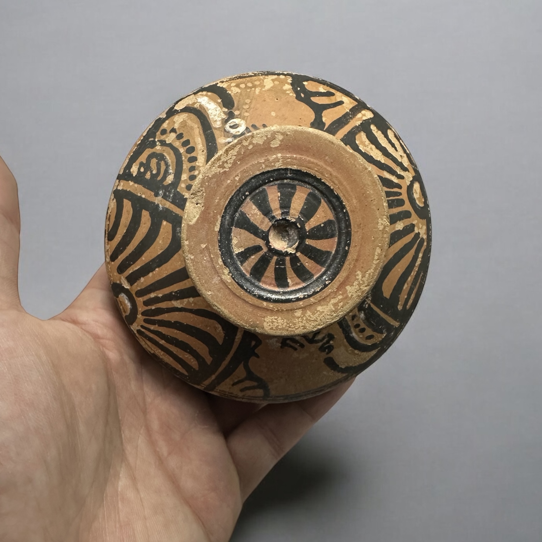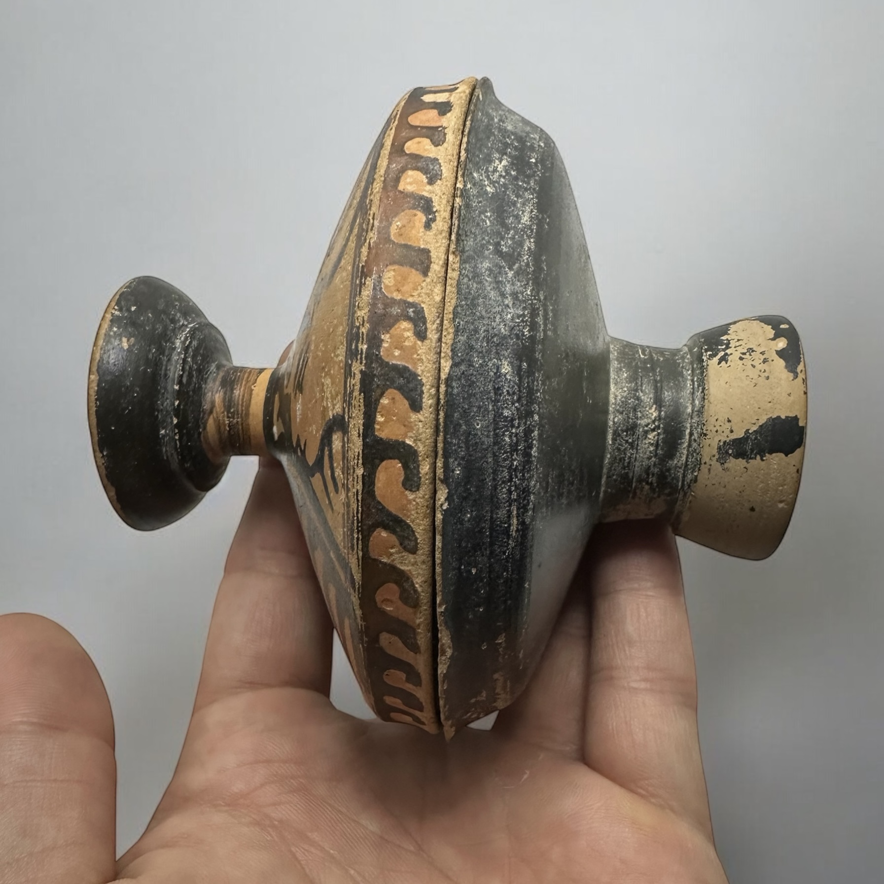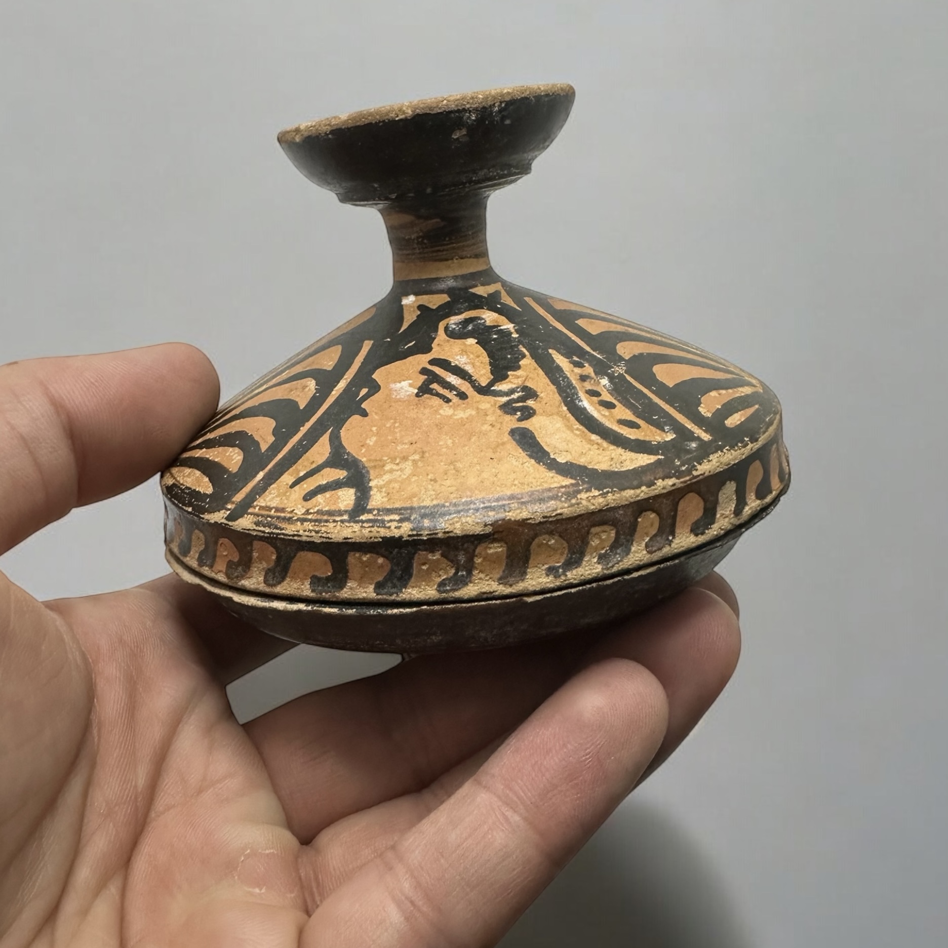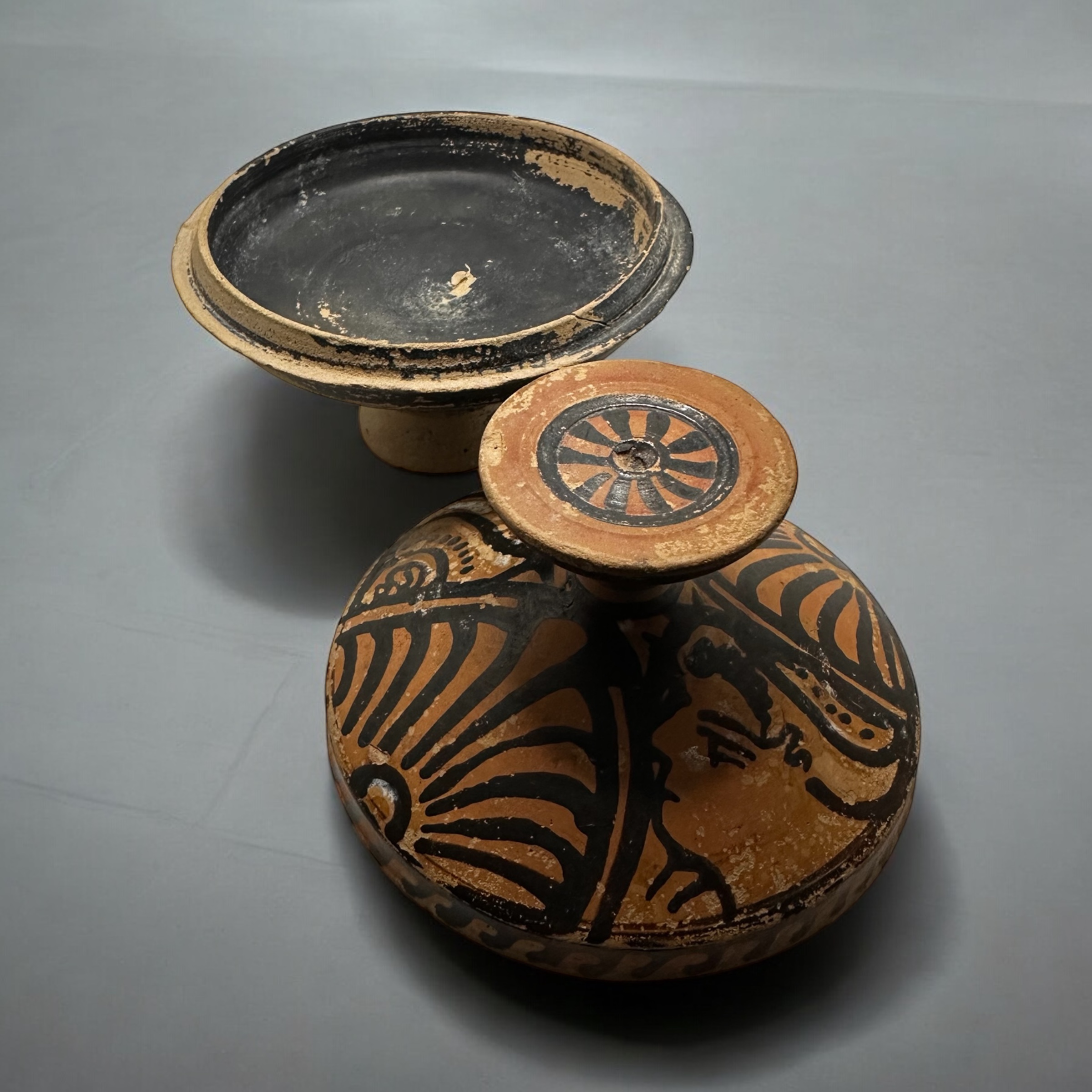 Apulia, South Italy, circa 4th Century B.C. A Greek red-figure lekanis, enlivened in white slip, the lid decorated with two profile female heads, palmettes in between, the top of the knob with radiating petals, the edge of the lip decorated with wave pattern.