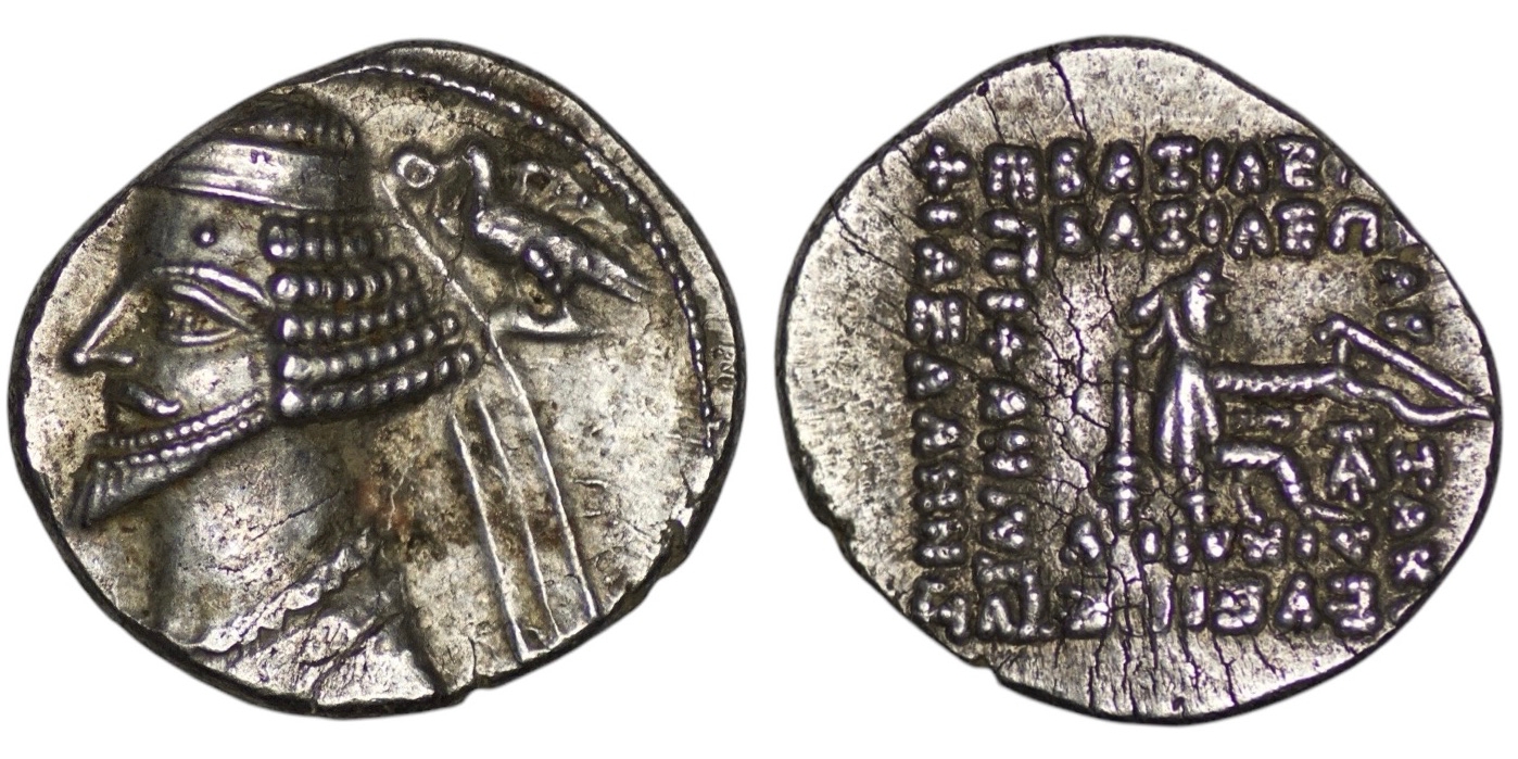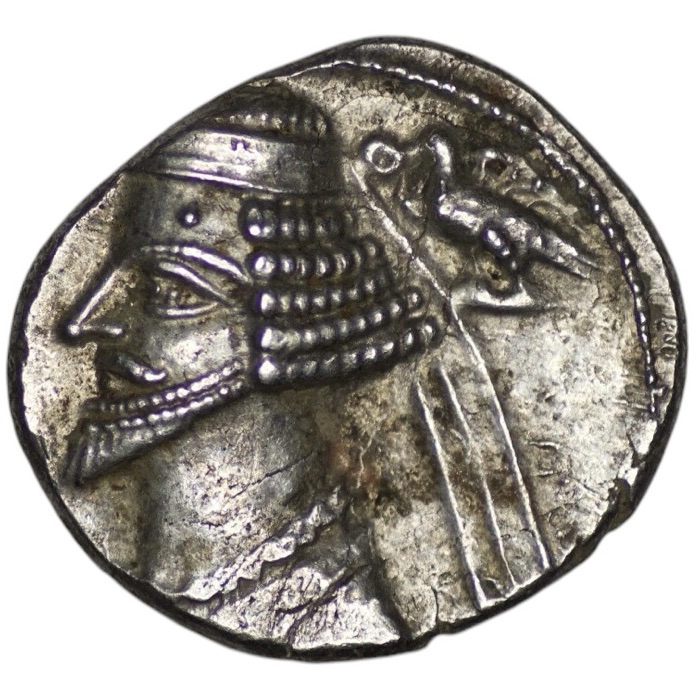 Parthian Empire. Phraates IV (Circa 38/7-2 BC). AR Drachm (3.75g/ 17mm). Diademed bust left; to right, eagle left, holding wreath in beak / Archer (Arsakes I) seated right on throne, holding bow; monogram below bow. Sellwood 52.10; Sunrise –; Shore 276-8. Very fine.