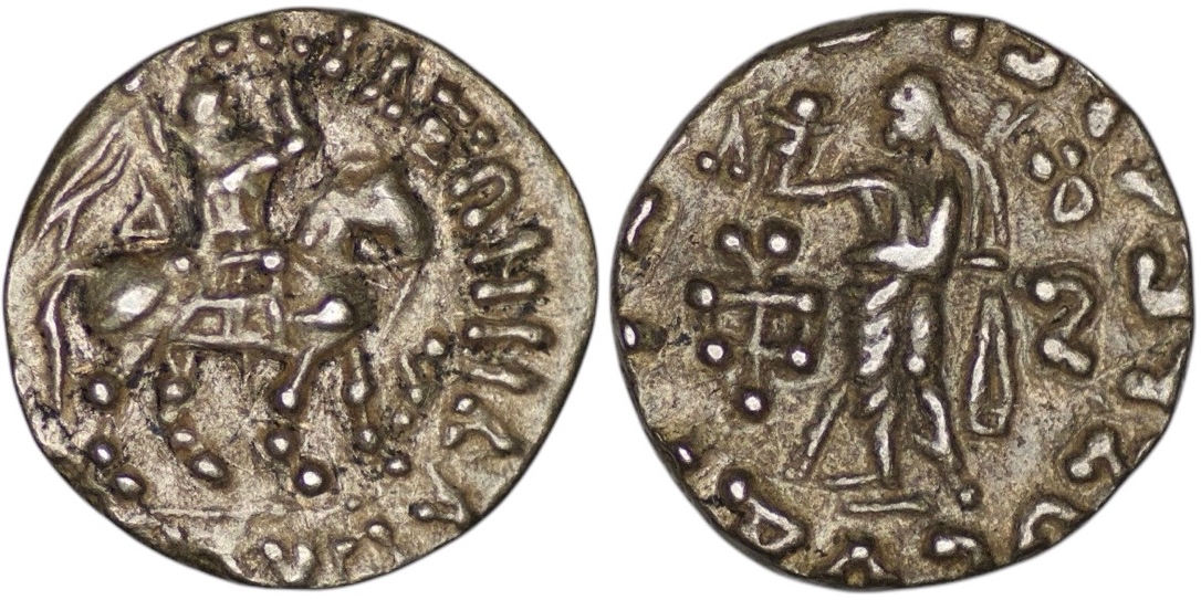 Indo-Scythian Kingdom. Azes. (58-12 BC). AR Drachm (2.34g/ 14mm). BAΣIΛEΩΣ BAΣIΛEΩN MEΓAΛOY AZOY, Azes on horseback right, holding whip ; Kharosthi letter before horse / Athena standing facing, holding spear and shield, right hand raised to helmet and holding spear and shield; monogram to left and right.