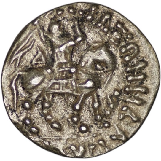 Indo-Scythian Kingdom. Azes. (58-12 BC). AR Drachm (2.34g/ 14mm). BAΣIΛEΩΣ BAΣIΛEΩN MEΓAΛOY AZOY, Azes on horseback right, holding whip ; Kharosthi letter before horse / Athena standing facing, holding spear and shield, right hand raised to helmet and holding spear and shield; monogram to left and right.