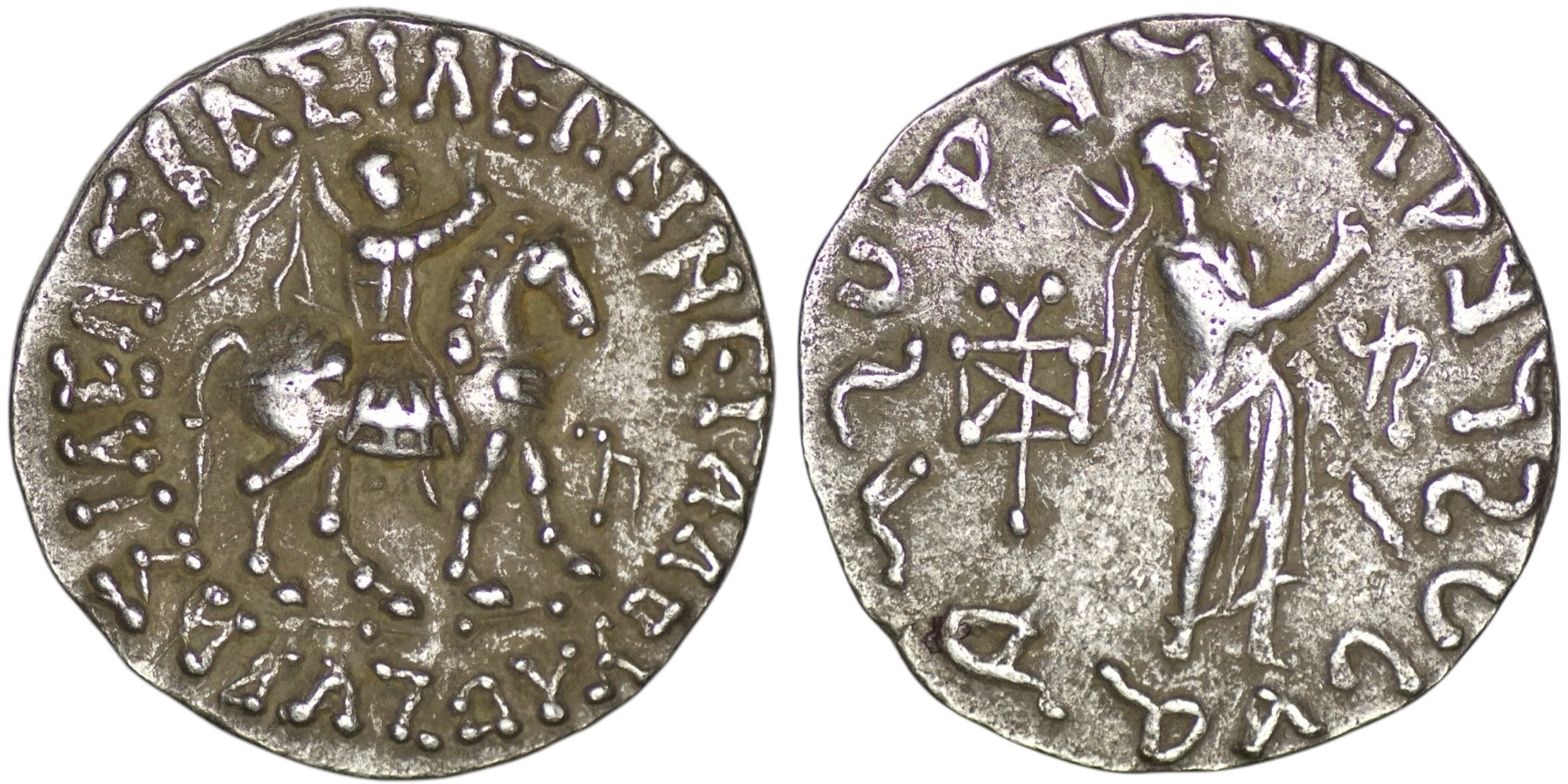 Indo-Scythian Kingdom. Azes II (ca. 35 BC – 5 AD). AR Tetradrachm (9.71g/ 24mm). Uncertain mint in western Gandhara. BAΣIΛEΩΣ BAΣIΛEΩN MEΓAΛOY; AZOY King on horseback to right, raising his right hand and holding whip in his left; to right, Karoshti ‘la’/ Maharajasa rajarajasa mahatasa Ayasa’ (‘of Great King, King of Kings Azes the Great’ in Karoshti) Athena standing facing, raising her right hand in blessing and holding shield in her left; behind her back, spear; to left and right, monograms. Hgc-12,637; Senior-98.300T. Extremely fine,
