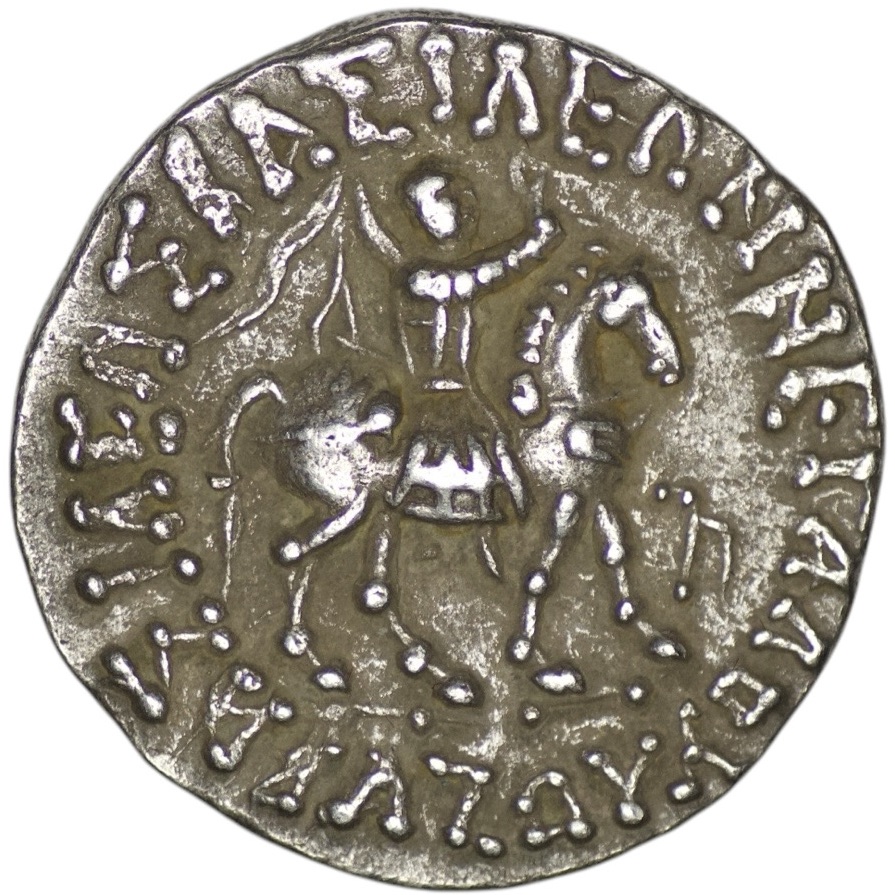 Indo-Scythian Kingdom. Azes II (ca. 35 BC – 5 AD). AR Tetradrachm (9.71g/ 24mm). Uncertain mint in western Gandhara. BAΣIΛEΩΣ BAΣIΛEΩN MEΓAΛOY; AZOY King on horseback to right, raising his right hand and holding whip in his left; to right, Karoshti ‘la’/ Maharajasa rajarajasa mahatasa Ayasa’ (‘of Great King, King of Kings Azes the Great’ in Karoshti) Athena standing facing, raising her right hand in blessing and holding shield in her left; behind her back, spear; to left and right, monograms. Hgc-12,637; Senior-98.300T. Extremely fine,