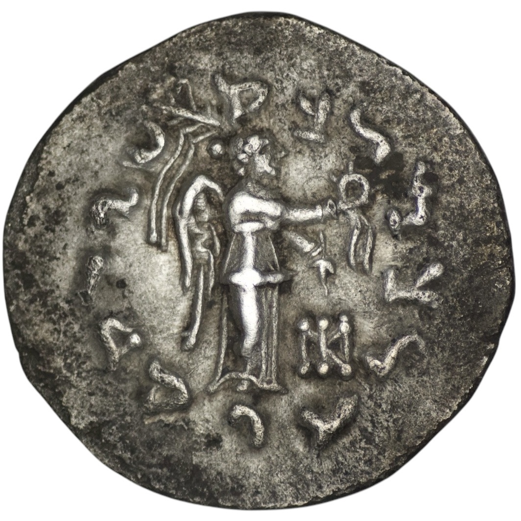 Indo-Scythian Kingdom. Maues (circa 125-85 BC). AR Tetradrachm (9.31g/ 26mm). Zeus standing left, extending hand and holding scepter / Nike standing right, holding filleted palm frond and wreath; monogram to lower right. Senior 1.2T; HGC 12, 524. Very fine, dark patina.