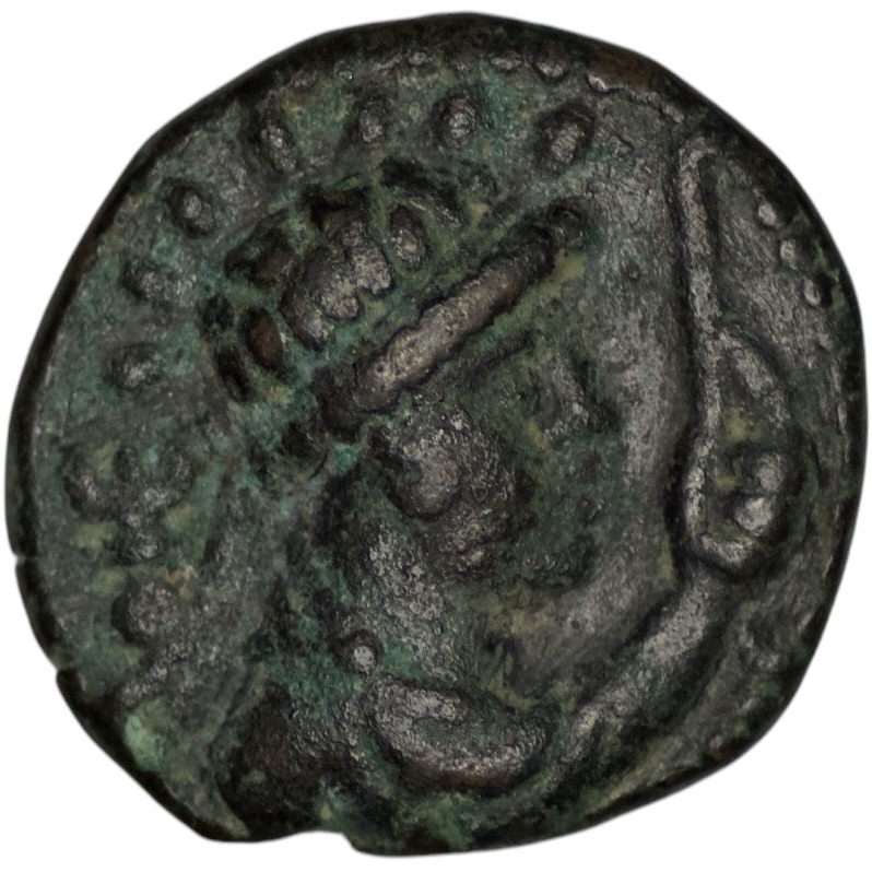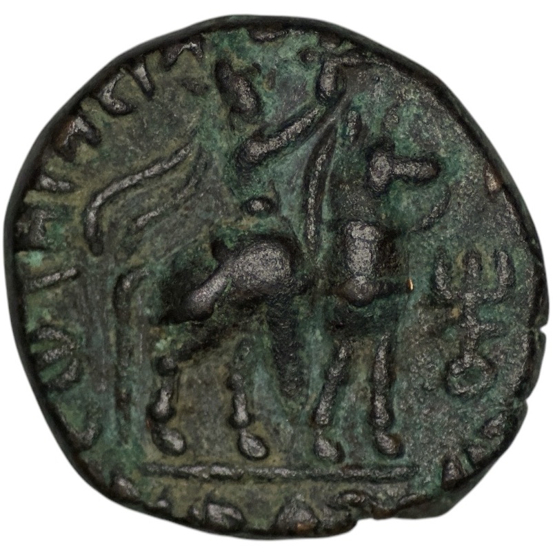 Kushan Empire. Vima Takto (Soter Megas) (circa AD 80-100). Æ Tetradrachm (8.74g/ 19mm). Radiate and diademed bust right, holding scepter; tamgha behind / Vima Takto on horseback right, holding axe; tamgha to lower right. Senior B17.1vT. Very fine. Dark and green patina.
