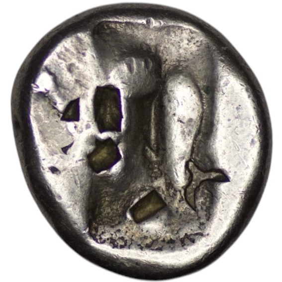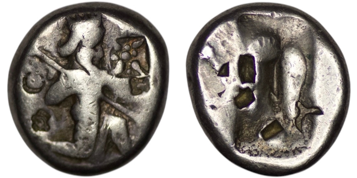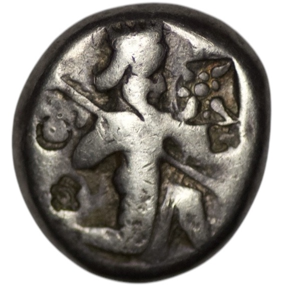 Achaemenid Empire. Time of Xerxes II to Artaxerxes III (c. 420-350 BC). AR Siglos. (5.42g/ 15mm). Carradice-Type IVa. Persian king or hero right, in kneeling-running stance, holding bow and dagger, quiver at shoulder, Countermarks / Incuse punch. Carradice Type IV. Bankers’ marks on obverse and reverse. Choice very fine. Beautiful toning.