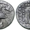 Obverse: Draped bust of Khosrau II to right, wearing elaborate mural crown; behind head, HWSRWD (‘Khosrau’ in Pahlawi)