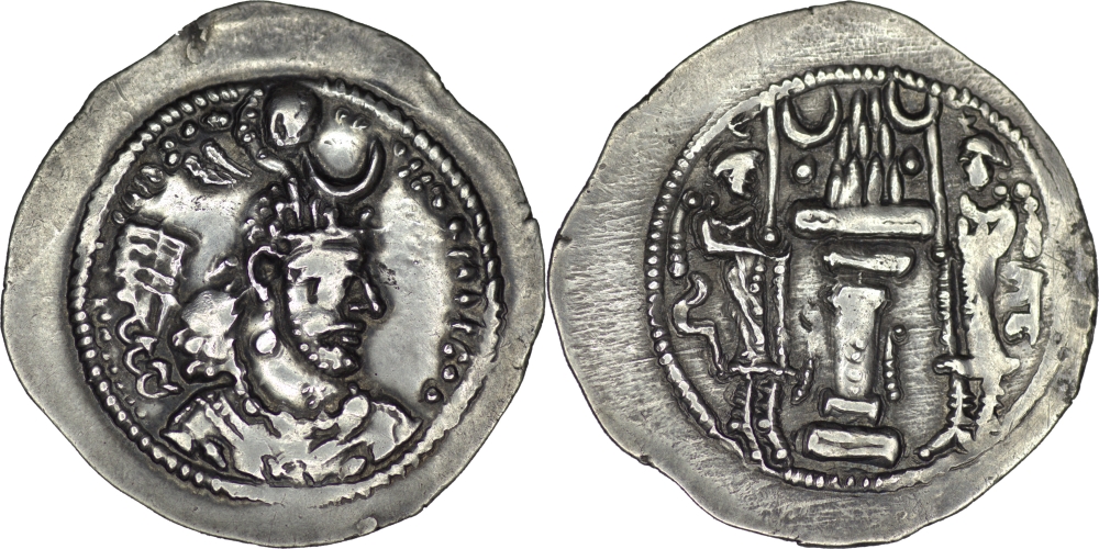 Sasanian Empire. Vahrām (Bahram) V. (AD 420-438). AR Drachm (4.16g/ 29mm ). GW (Gurgan) mint. Struck circa AD 425-438. Bust right, wearing mural crown with korymbos set on crescent / Fire altar with head of Vahrām (Bahram) right on shaft; flanked by two attendants; mint signature to right. SNS type Ia/2; Sunrise 920. Extremely fine and toned.
