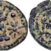 SASANIAN EMPIRE, Vahram V (Varahran), AD. 420-438. Æ Pashiz (1.60 gm; 15 mm). Vahram’s bust right, diadem and crescent to right / fire-altar & two attendants. Gobl I/1. Very rare.Nice original green earthen patina. VF.